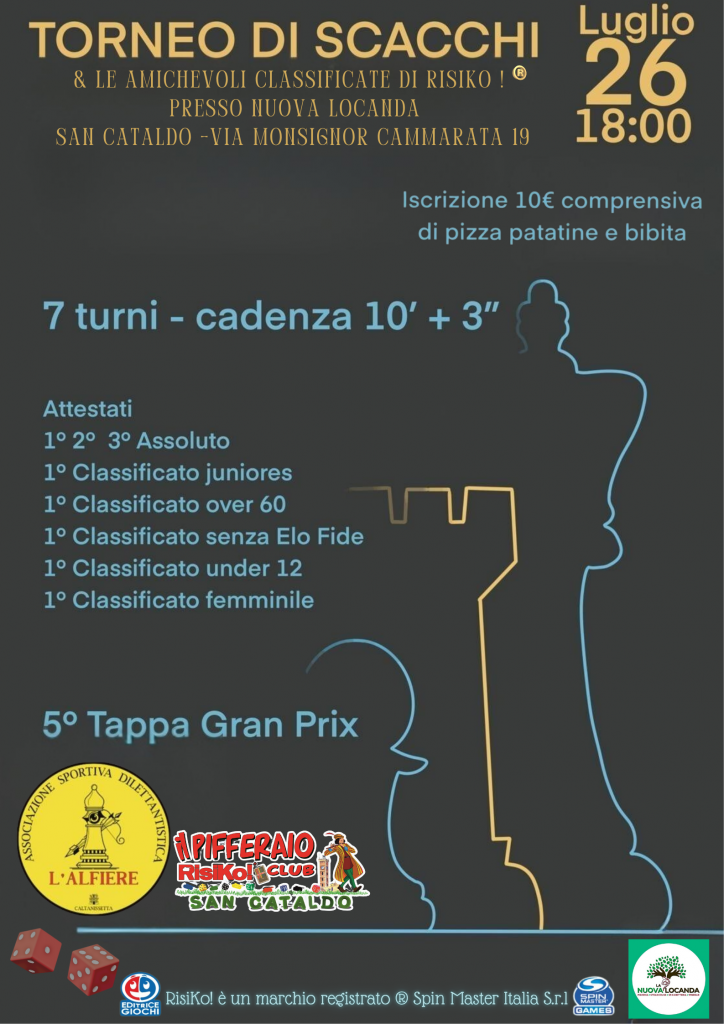 Le attività di gioco del Risiko Club Ufficiale “Il Pifferaio”, in questi mesi di luglio e agosto, si limiteranno all’organizzazione di serate di amichevoli classificate. Il giorno 9 luglio si è disputato il secondo turno del 2° semestre 2025 e mercoledì 16 luglio sarà organizzato il terzo turno sempre presso gli accoglienti locali della Nuova Locanda del Buon Samaritano di San Cataldo. Per il giorno Sabato 26 luglio, poi, è in preparazione nella stessa un grande evento di gioco in collaborazione con il Circolo Alfieri di Scacchi di Caltanissetta (di seguito la locandina dell’evento). Nel corso della serata anche i festeggiamenti per l’avvenuta promozione del Club Sancataldese a Risiko Club Ufficiale.