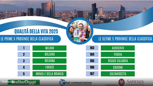 Milano conquista nuovamente il primo posto, con ottimi risultati nella dotazione di servizi, reddito, gestione delle infrastrutture, vitalità del tessuto produttivo, seguita da Bolzano e Bologna, nell’Indagine annuale sulla qualità della vita 2025 nelle province italiane, realizzata da ItaliaOggi e Ital Communications, in collaborazione con l’Università Sapienza di Roma, giuntaalla 27ª edizione. Rispetto alla classifica dello scorso anno, per Milano e Bolzano si tratta di una conferma, mentre migliora Bologna che sale di una posizione. Due passi indietro, invece, per Monza e della Brianza, mentre si segnala un significativo avanzamento in graduatoria di Rimini e Ascoli Piceno, rispettivamente al 12° e 15° posto, con oltre venti posizioni guadagnate rispetto al 2024. Ancora in fondo alla classifica Caltanissetta (107ª), preceduta da Crotone (106ª), che scende di cinque posizioni in un anno e Reggio Calabria (105ª), che invece conquista un posto. Da rilevare, in negativo, Foggia, che passa dalla 93ª alla 104ª posizione in classifica, Pordenone dalla 9ª alla 23ª e Gorizia dalla 26ª alla 52ª.