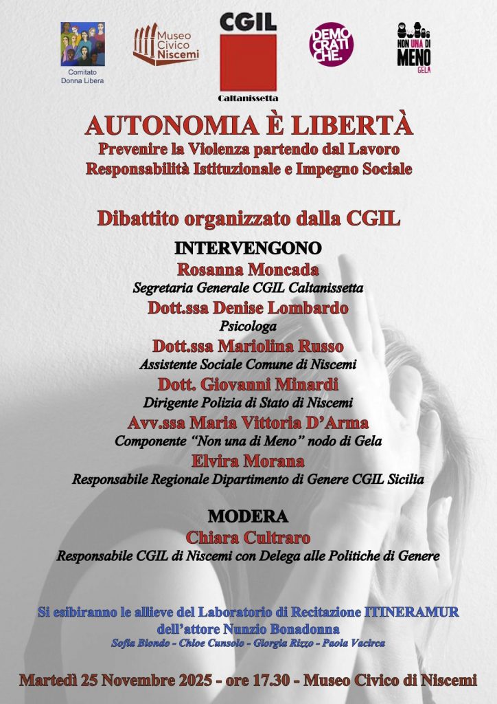 Autonomia e’ Liberta’ , Prevenire la violenza partendo dal lavoro, responsabilità istituzionale e impegno sociale è il titolo dell’iniziativa promossa il 25 novembre dalla Cgil di Caltanissetta al museo civico di Niscemi