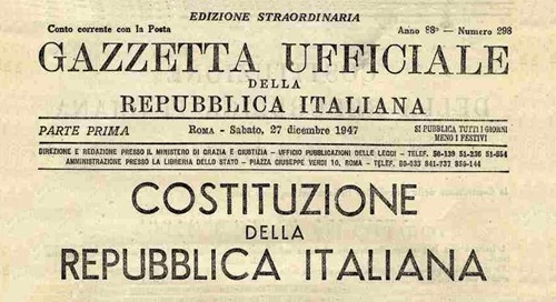 Approvata dall’Assemblea Costituente il 22 dicembre 1947 e promulgata dal capo provvisorio dello Stato Enrico De Nicola il 27 dicembre seguente, fu pubblicata sulla Gazzetta Ufficiale n. 298, edizione straordinaria, dello stesso giorno, ed entrò in vigore il I gennaio 1948.