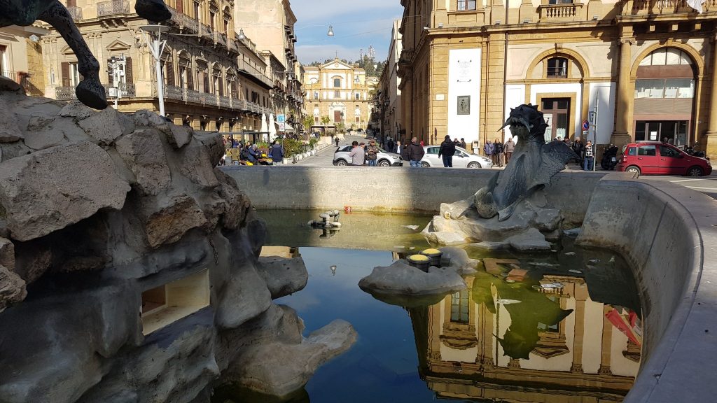 “Le vie, le arterie fondamentali della città di Caltanissetta si incrociano organicamente, generando il centro, il cuore della Città: Piazza Garibaldi. Al centro di Piazza Garibaldi è situata la Fontana del Tritone, una grande vasca neobarocca sovrastata da un gruppo scultoreo in bronzo, simbolo riconosciuto della Città. Il monumento è composto dal mitico Tritone con un tridente in mano mentre trattiene un cavallo imbizzarrito; Tritone, inoltre, appare insidiato, frontalmente, da due mostri marini. Assai suggestivi sono i giochi d’acqua che erompono dalla fontana. Fontana che – metaforicamente – potremmo definire “suggestivo frammento di Mediterraneo”. Ecco: questo è quello che potremmo scrivere in una seducente brochureper la promozione turistica di Caltanissetta.