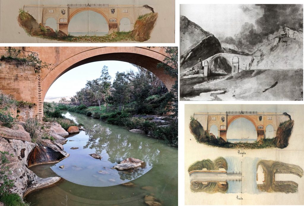 2. Il ponte scavalca il fiume Imera Meridionale al confine dei territori di Caltanissetta ed Enna (un tempo Castrogiovanni). Abbiamo una preziosa testimonianza iconografica del manufatto originario grazie al pittore francese Jean Houel che, nel 1778, lo rappresentò in una sua veduta paesaggistica. Il Ponte è comunque da attribuire alla città di Caltanissetta: un documento del 21 luglio del 1620 attesta che il costo della riparazione della sua pavimentazione è totalmente a carico della municipalità nissena, sebbene si tratti della rampa di accesso dal lato Castrogiovanni.