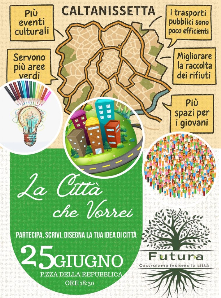 Il gruppo politico “Futura – costruiamo insieme la Città”, nell’ottica di prepararsi al governo della città, invita tutti i cittadini a partecipare al primo incontro pubblico “La Città che Vorrei”, che si terrà martedì 25 giugno alle ore 18:30 in Piazza della Repubblica, a Caltanissetta.