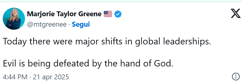 AGI – Non tutti hanno espresso cordoglio per la scomparsa di papa Francesco. La rappresentante trumpiana al Congresso, Marjorie Taylor Greene, fedelissima del presidente degli Stati Uniti, ha celebrato la morte del pontefice. “Oggi” ha scritto sul suo account su X, seguito da un milione e mezzo di persone “ci sono stati grandi cambiamenti nella leadership globale. Il male viene sconfitto per mano di Dio“.