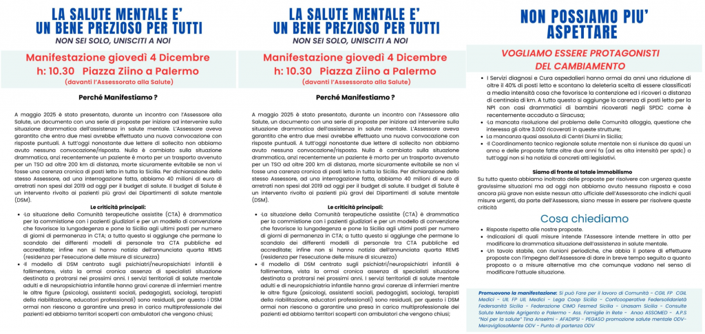 Alla luce della grave situazione assistenziale venutasi a determinare in Sicilia si è ritenuto opportuno indire una manifestazione pubblica a Palermo per il 4 Dicembre alle 10,30 a Palermo davanti la sede dell’Assessorato alla Salute.