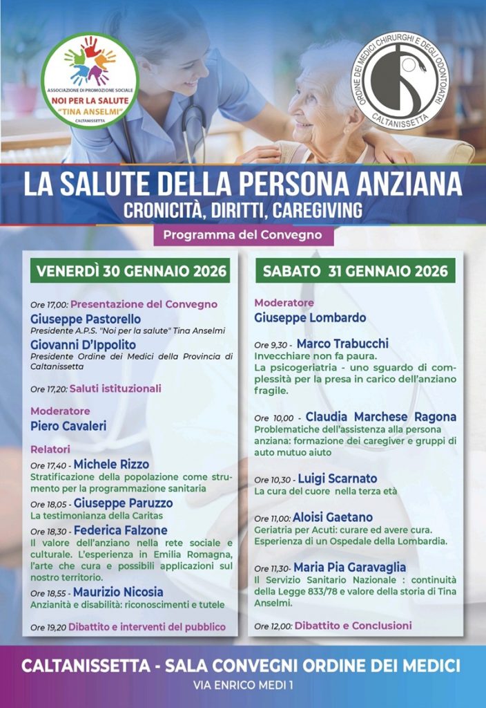 Cronicità, Diritti, Caregiving”, organizzato dall’Associazione di Promozione Sociale “Noi per la Salute ‘Tina Anselmi'” di Caltanissetta e patrocinato dall’Ordine dei Medici Chirurghi e Odontoiatri della Provincia nissena. L’evento si svolgerà nella sala convegni dell’OMCeO di Caltanissetta nel pomeriggio di venerdì 30 gennaio 2026 e durante la mattina di sabato 31 gennaio 2026.