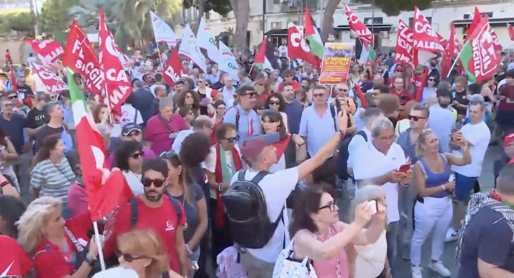 Le imbarcazioni si stanno avvicinando nella zona a rischio. Scende in campo il sindacato guidato da Maurizio Landini. L’Assemblea Generale della Cgil “ritiene necessario intensificare ed estendere la mobilitazione per fermare il genocidio del popolo palestinese in corso da parte del governo israeliano di Netanyahu” e dà mandato alla segreteria di proclamare lo sciopero generale tempestivo per tutte le categorie in caso di attacchi, blocchi o sequestri delle imbarcazioni e materiali della missione umanitaria della Global Sumud Flotilla, si legge in una nota diffusa dopo la riunione.
