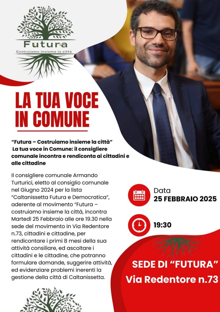 “Futura – costruiamo insieme la città”, organizza per Martedì 25 Febbraio alle ore 19.30 nella sede di Via Redentore n.73, il primo degli incontri “La tua voce in Comune”, con il consigliere comunale Armando Turturici, eletto al Consiglio Comunale nel Giugno 2024 per la lista Caltanissetta Futura e Democratica, e aderente al movimento Futura.