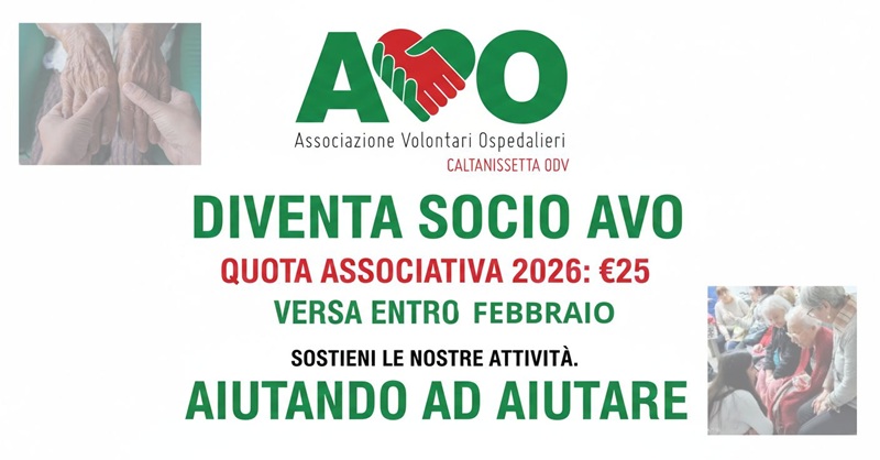 L’Associazione Volontari Ospedalieri (AVO) di Caltanissetta ODV annuncia ufficialmente l’apertura della campagna per il tesseramento 2026. Sotto il motto “Aiutando ad aiutare”, l’associazione invita la cittadinanza a sostenere concretamente le attività di volontariato e vicinanza alle persone fragili che l’organizzazione porta avanti con dedizione costante.