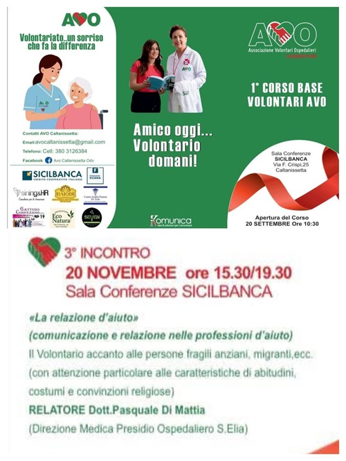 Prosegue con successo il percorso formativo dell’Associazione Volontari Ospedalieri (AVO) di Caltanissetta , che annuncia il 3° Incontro dedicato a un tema fondamentale per l’attività di volontariato: “La relazione d’aiuto (comunicazione e relazione nelle professioni d’aiuto)”.