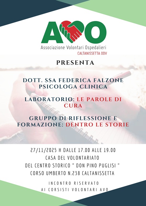L’evento, intitolato specificamente “Gruppo di Riflessione e Formazione: Dentro le Storie”, mira a fornire strumenti pratici per la gestione emotiva e l’approfondimento della dimensione narrativa all’interno dell’esperienza di volontariato ospedaliero e si terrà giovedì 27 novembre presso la casa delle culture e del volontariato Don Pino Puglisi, corso Umberto 238 Caltanissetta.