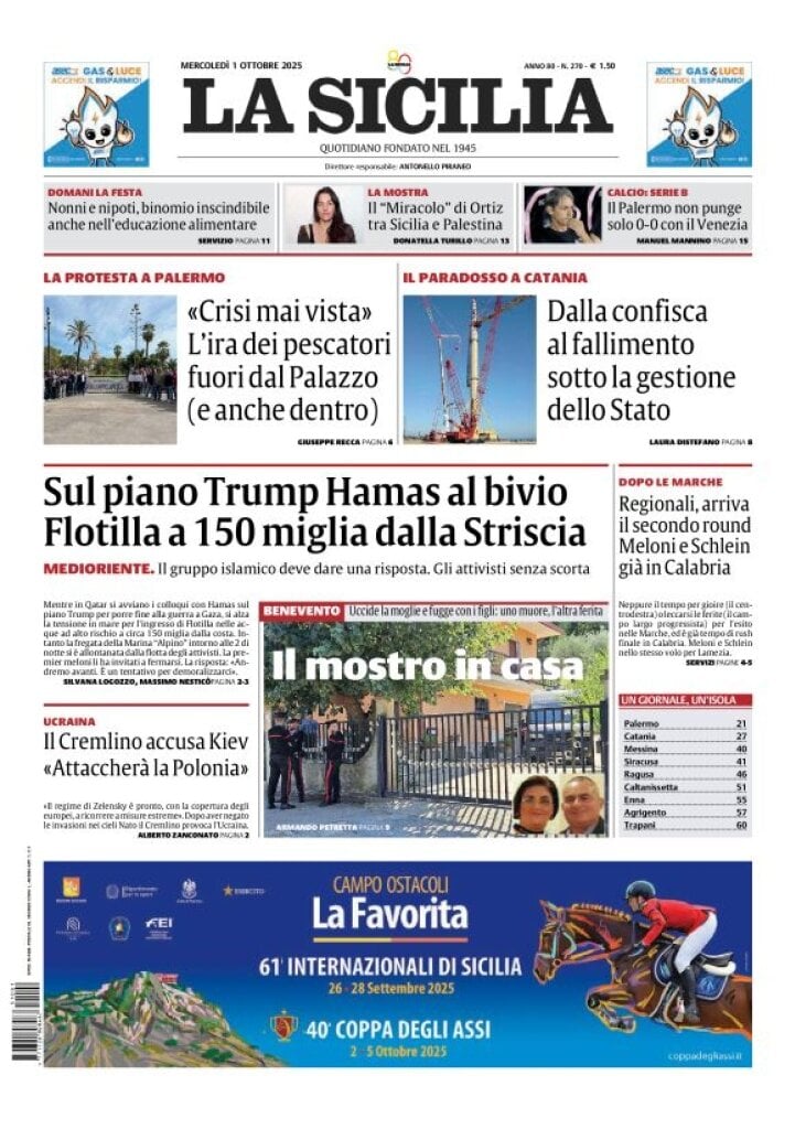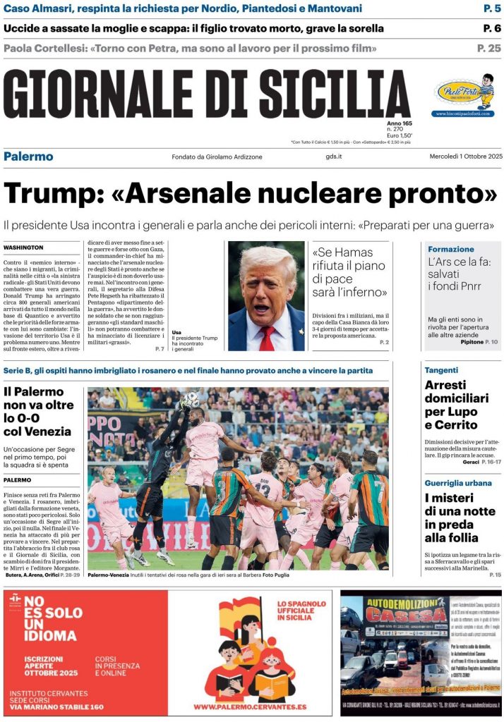 Le prime pagine delle maggiori testate giornalistiche siciliane, nazionali, economiche e sportive di Mercoledì 1 Ottobre 2025