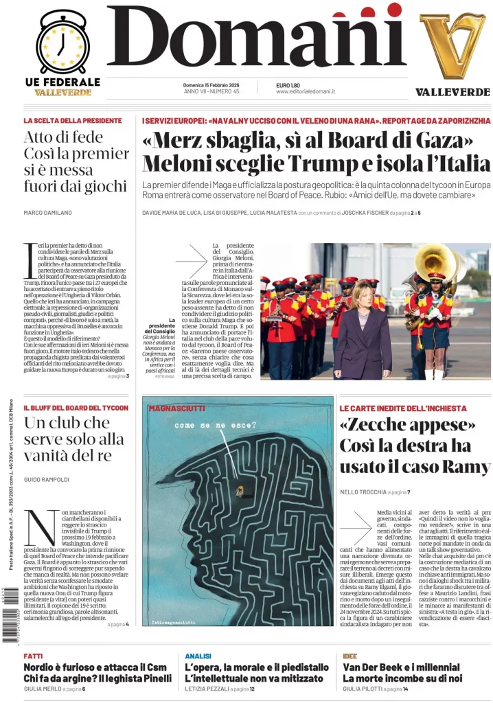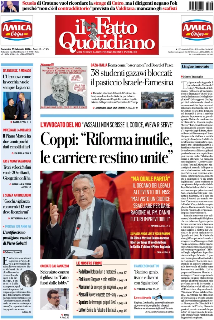 Le prime pagine delle maggiori testate giornalistiche siciliane, nazionali, economiche, sportive e straniere in Italia di Domenica 15 Febbraio 2026