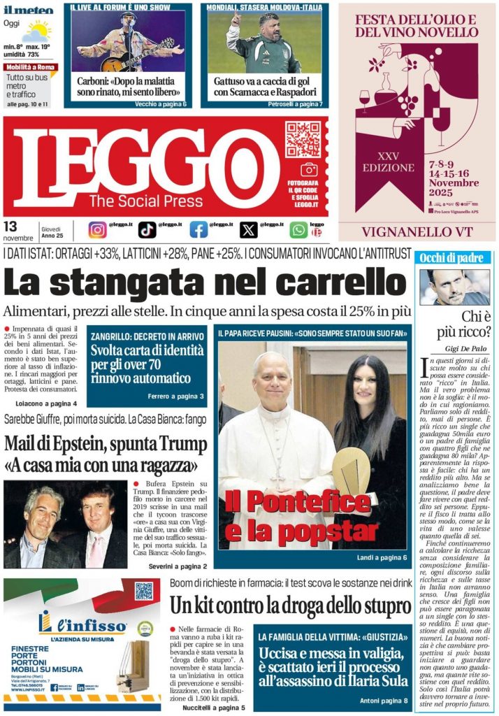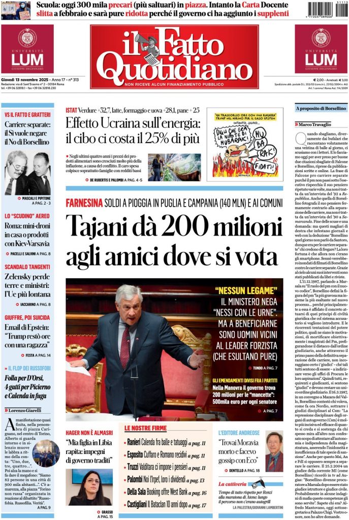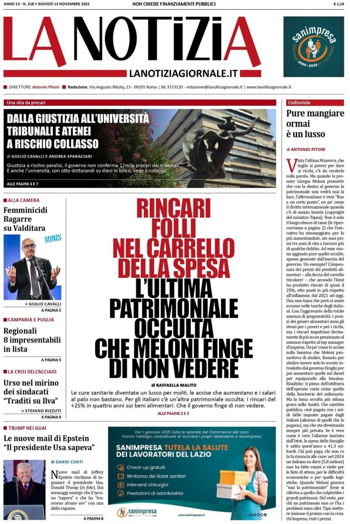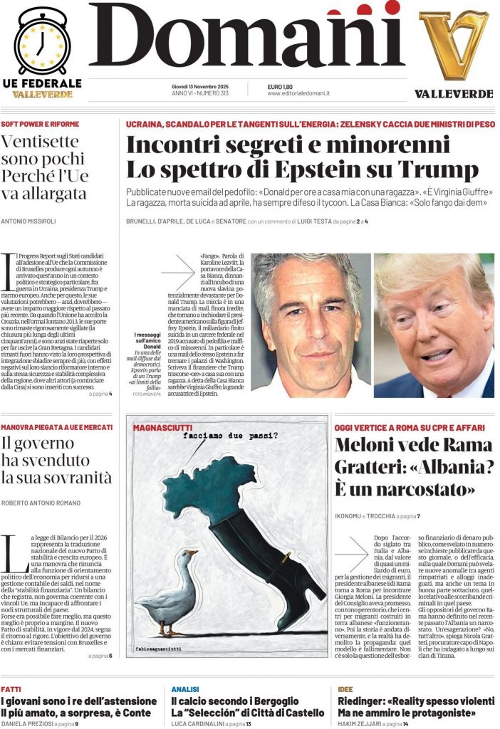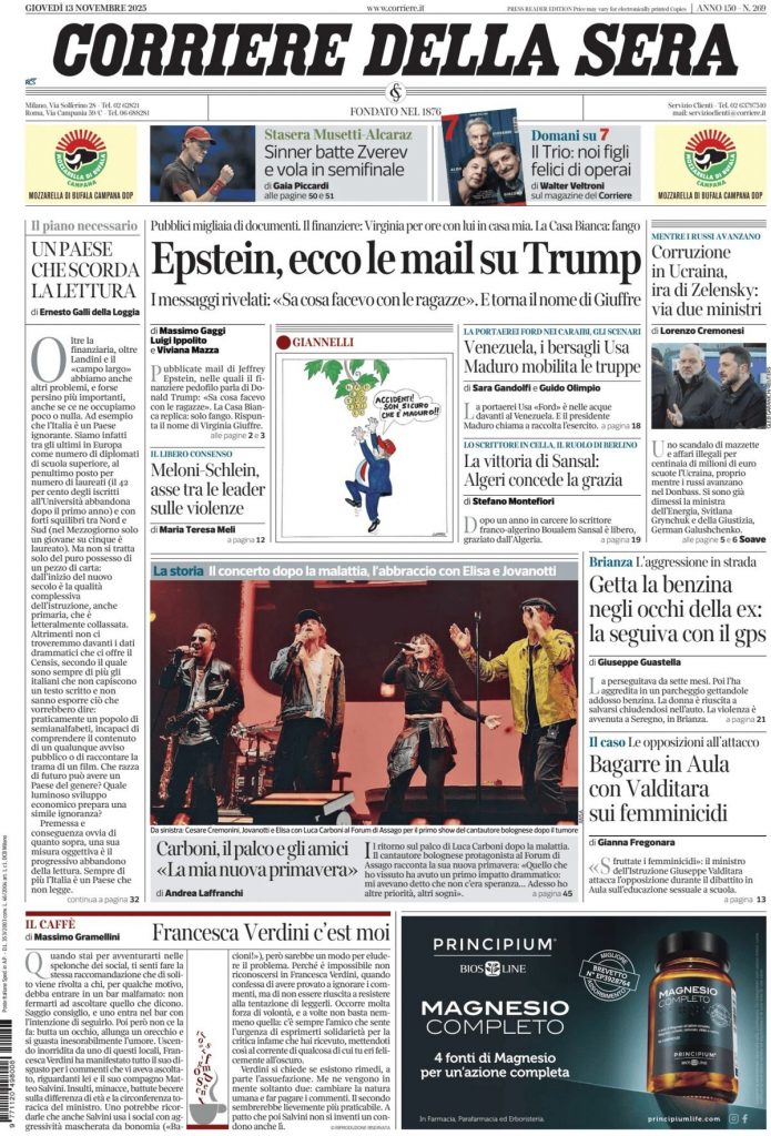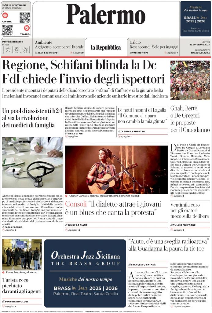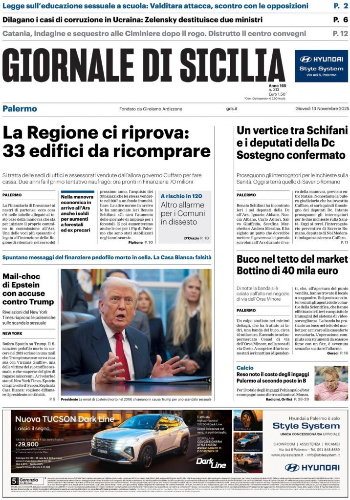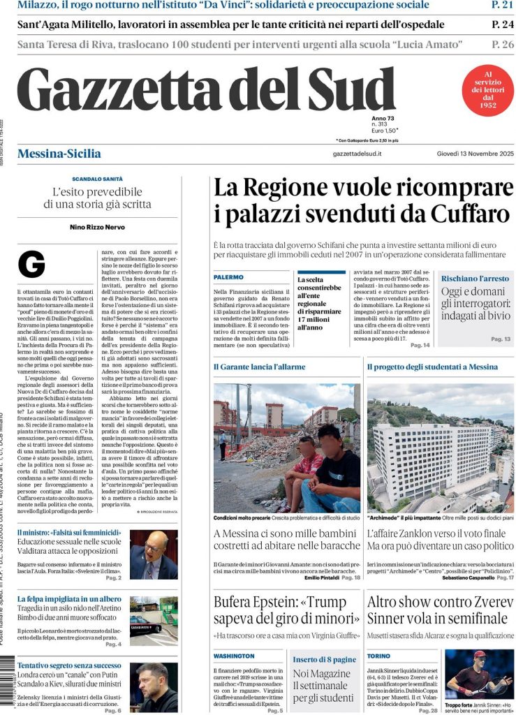 Reading: Le prime pagine delle maggiori testate giornalistiche siciliane, nazionali, economiche, sportive e straniere in Italia di Giovedì 13 Novembre 2025