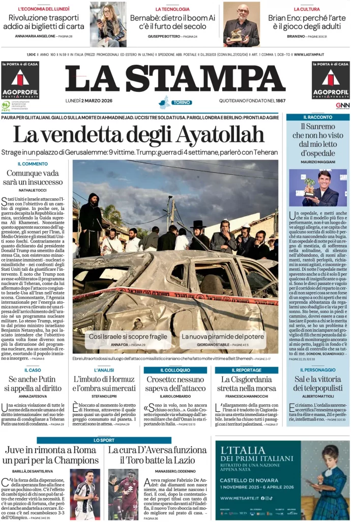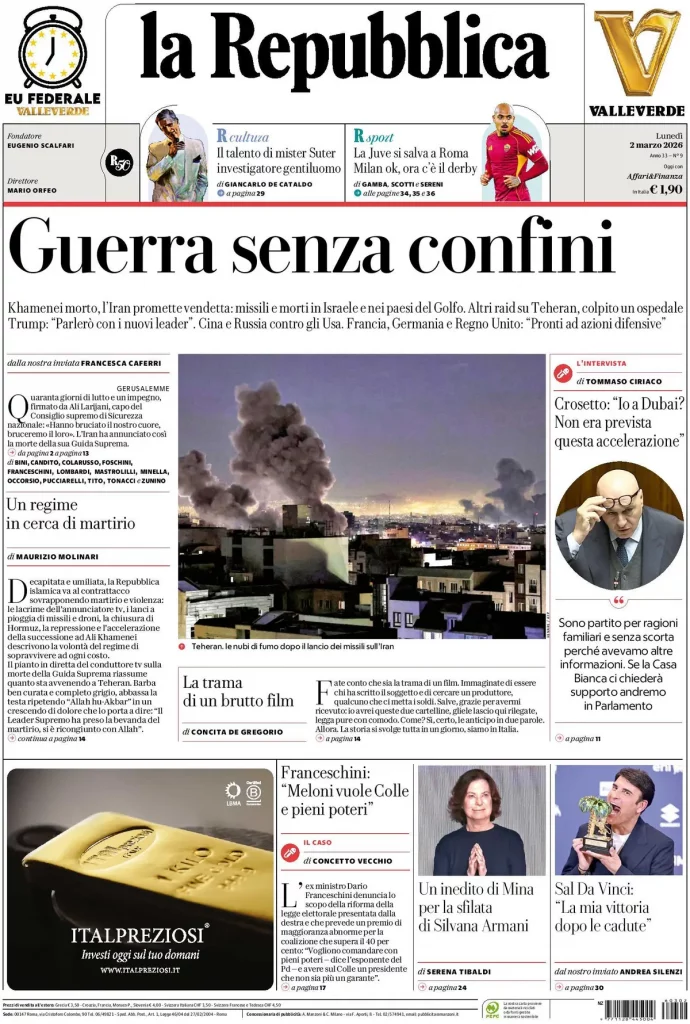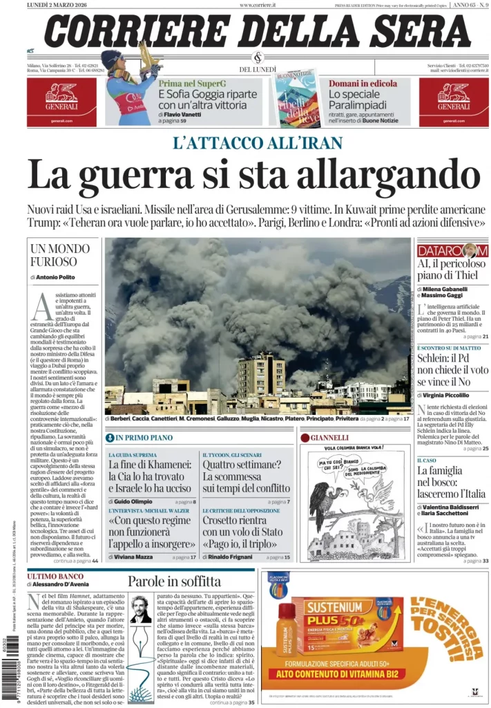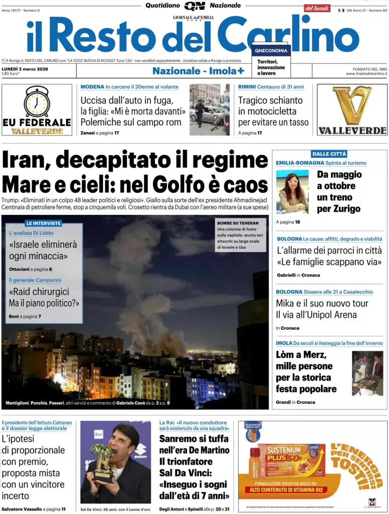 Le prime pagine delle maggiori testate giornalistiche siciliane, nazionali, economiche, sportive e straniere in Italia di Lunedì 2 Marzo 2026