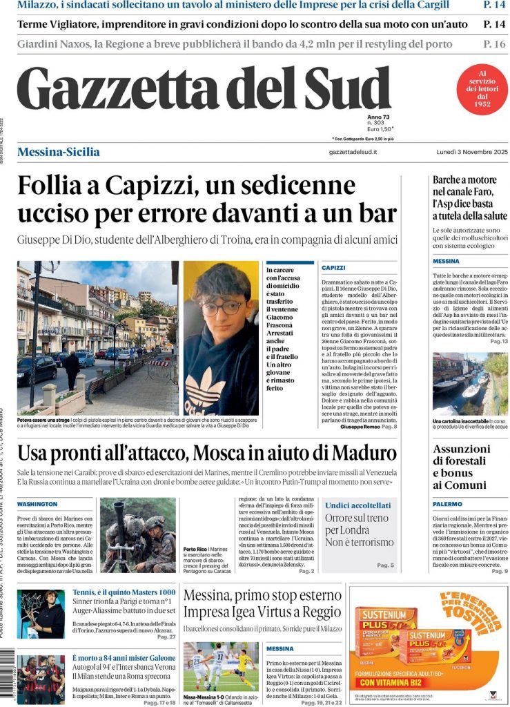 Caltanissetta 401 > News > Rassegna stampa > Le prime pagine delle maggiori testate giornalistiche siciliane, nazionali, economiche, sportive e straniere in Italia di Lunedì 3 Novembre 2025