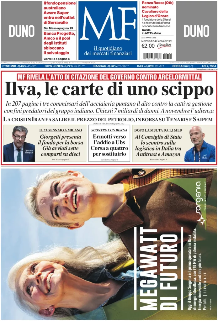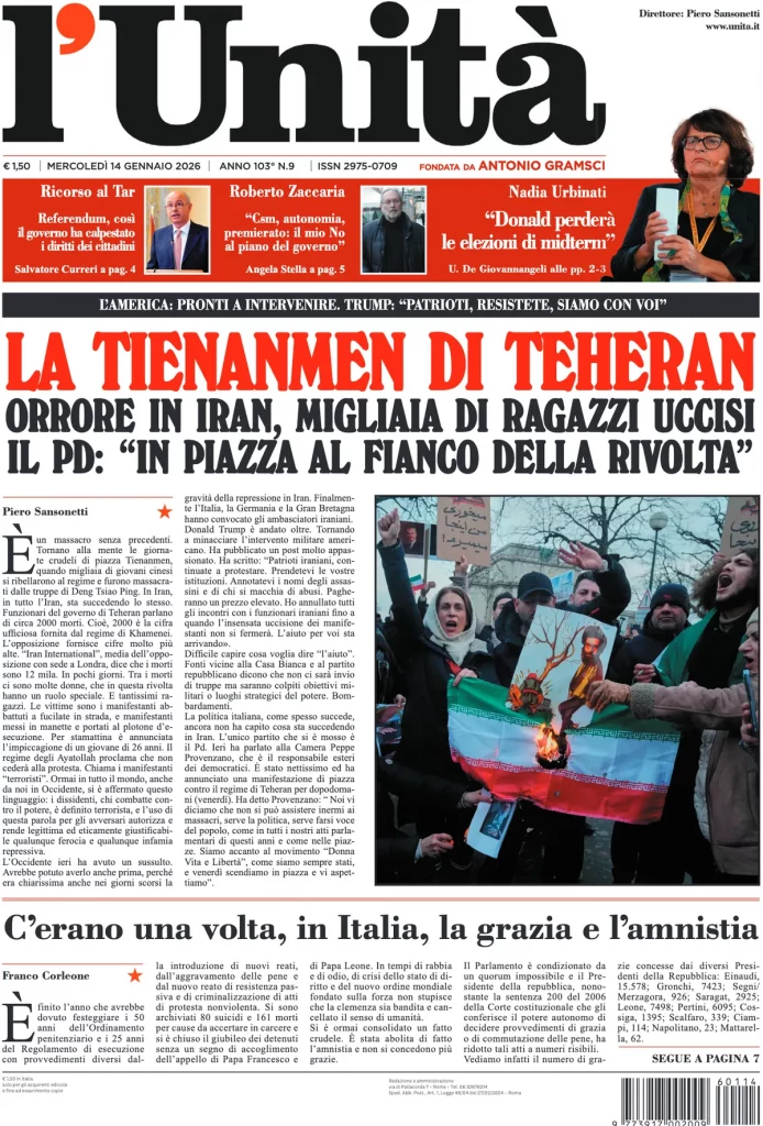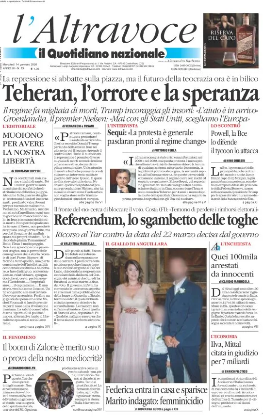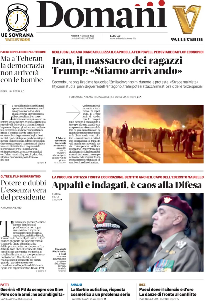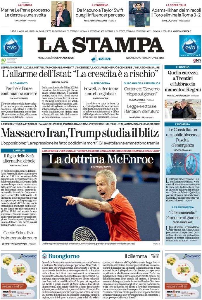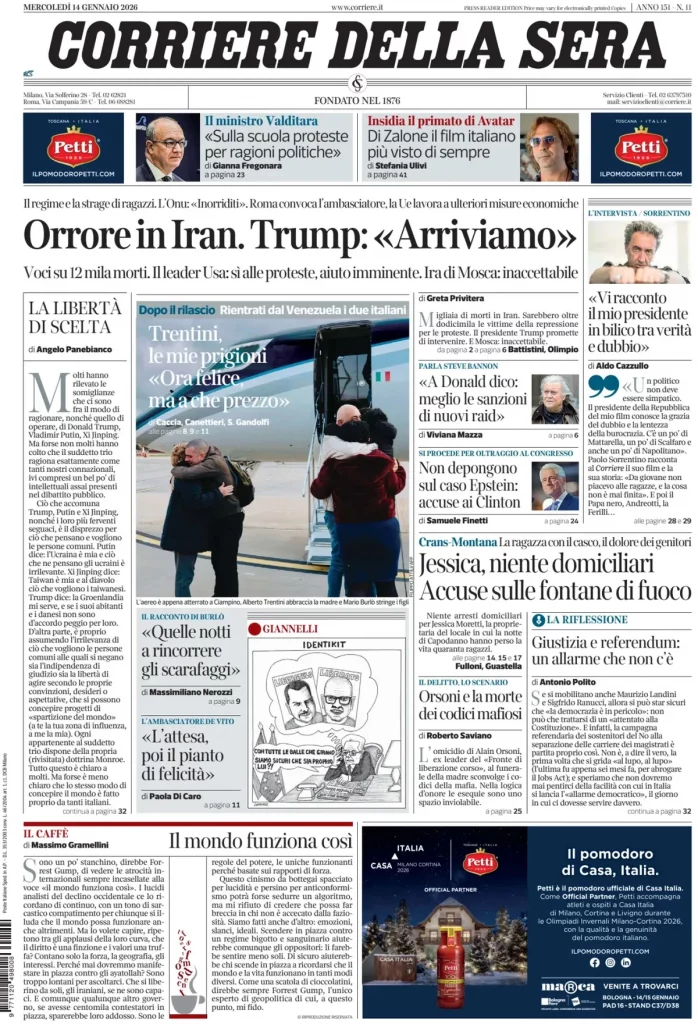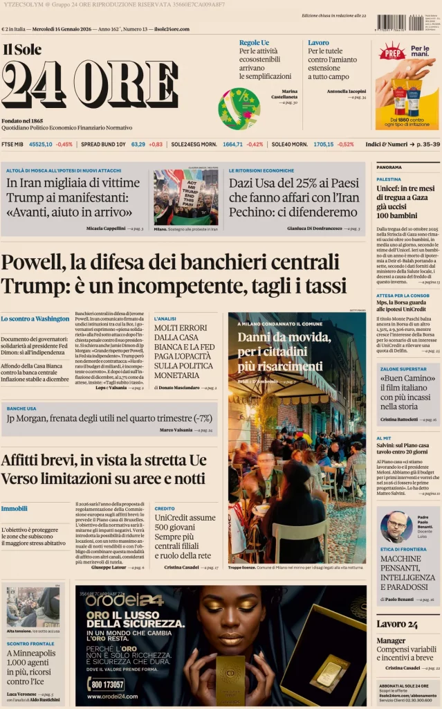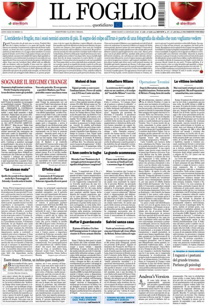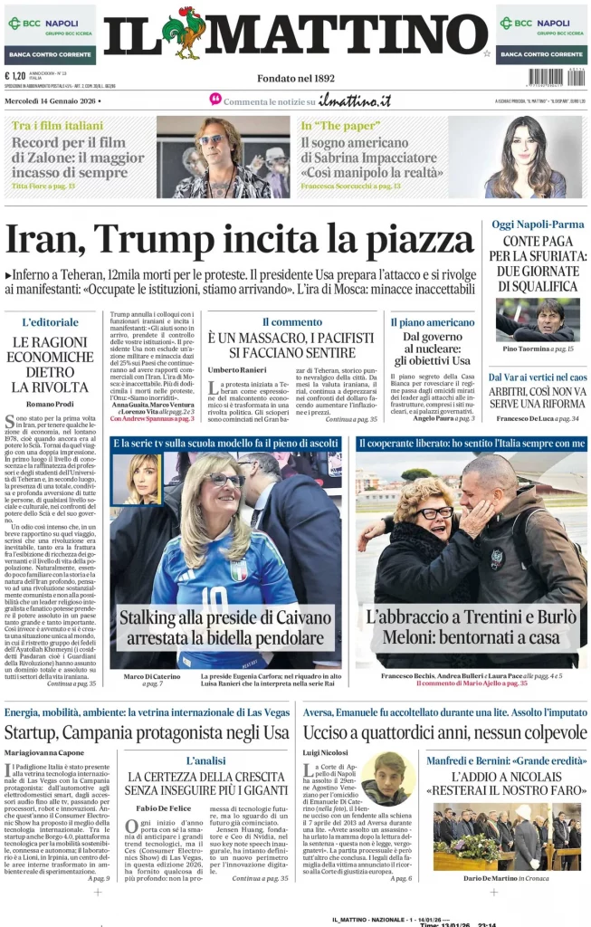 Reading: Le prime pagine delle maggiori testate giornalistiche siciliane, nazionali, economiche, sportive e straniere in Italia di Mercoledì 14 Gennaio 2026