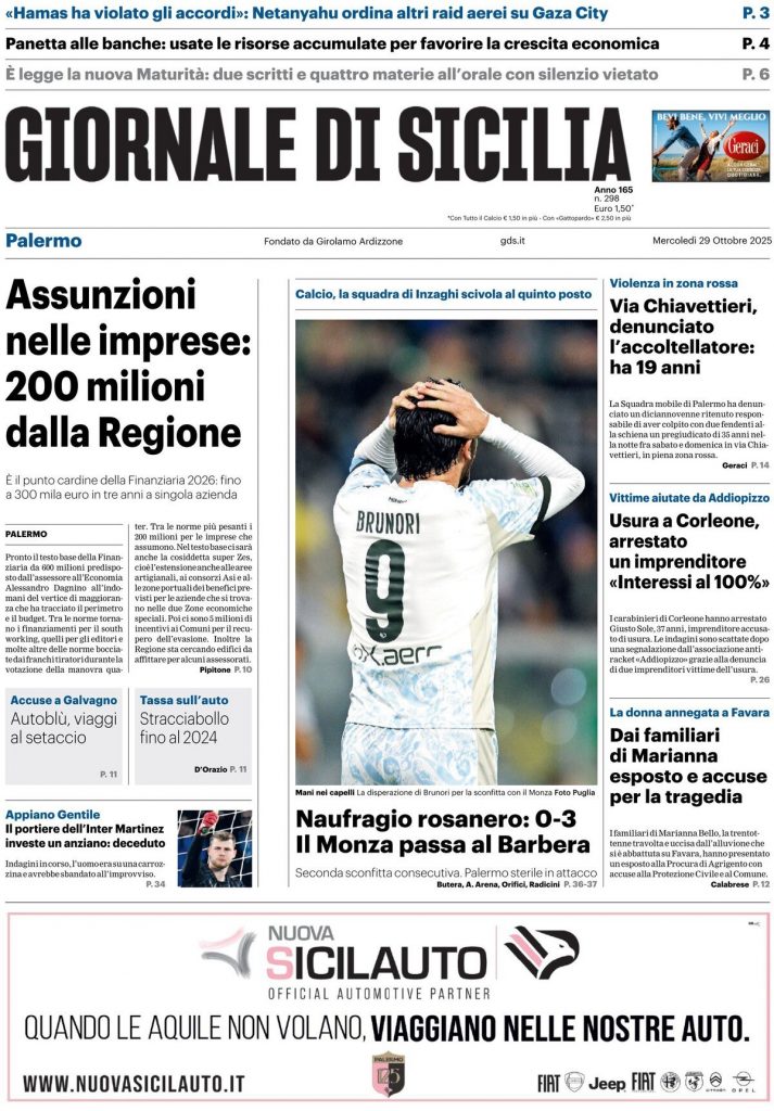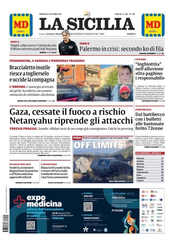 Caltanissetta 401 > News > Rassegna stampa > Le prime pagine delle maggiori testate giornalistiche siciliane, nazionali, economiche, sportive e straniere in Italia di Mercoledì 29 Ottobre 2025