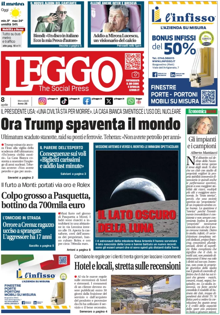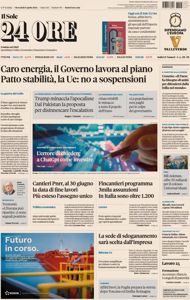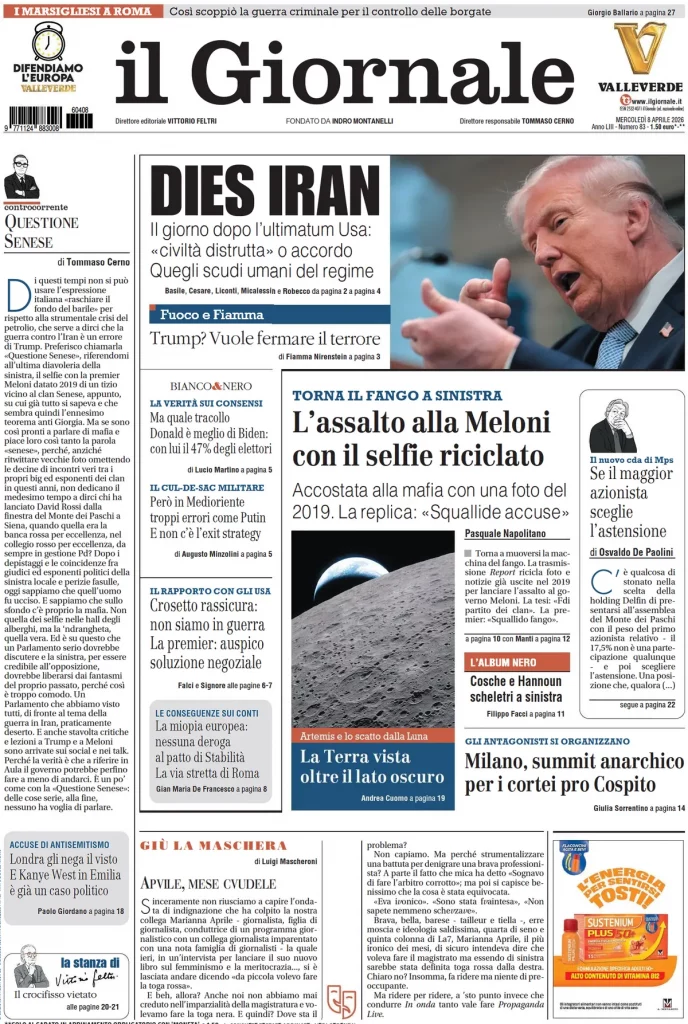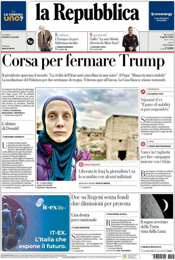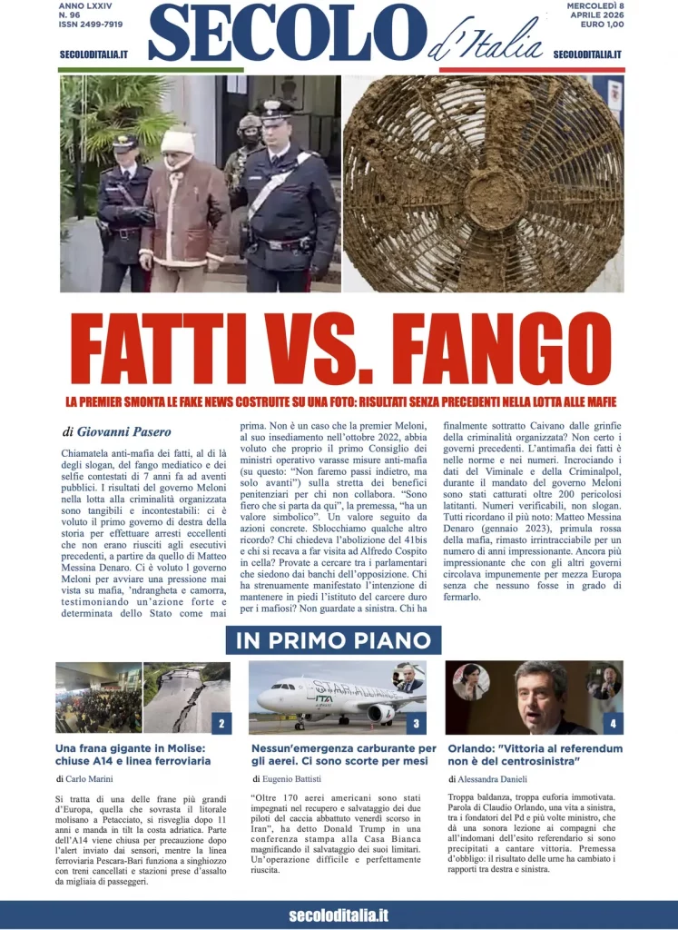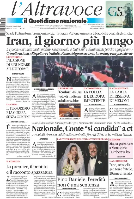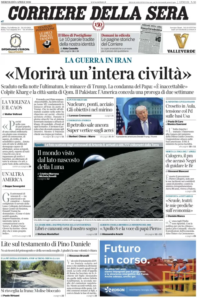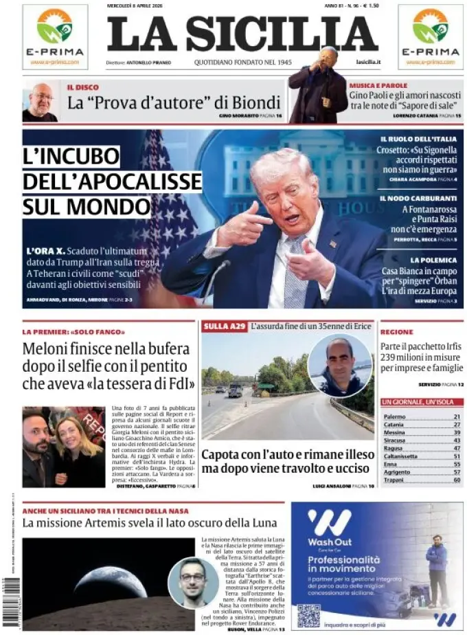 Caltanissetta 401 > News > Rassegna stampa > Le prime pagine delle maggiori testate giornalistiche siciliane, nazionali, economiche, sportive e straniere in Italia di Mercoledì 8 Aprile 2026
