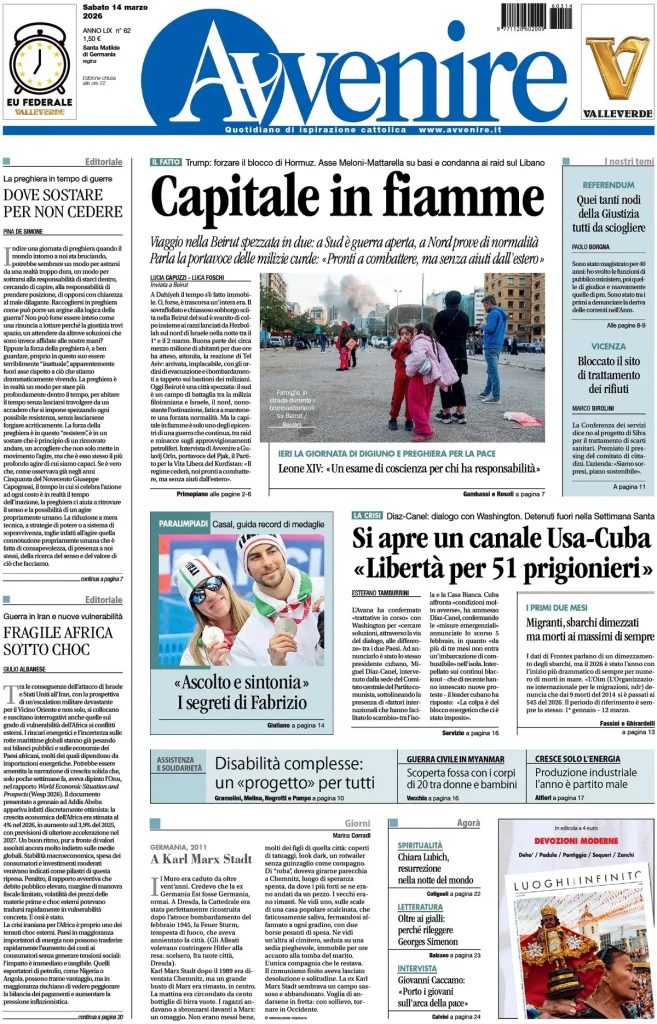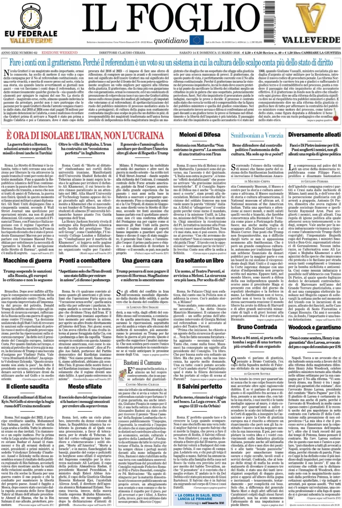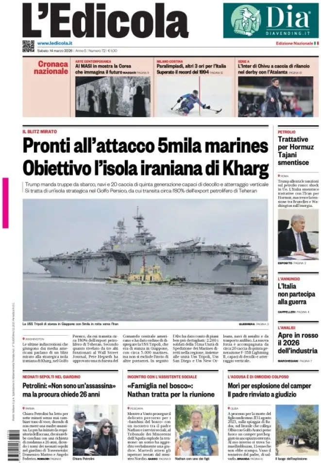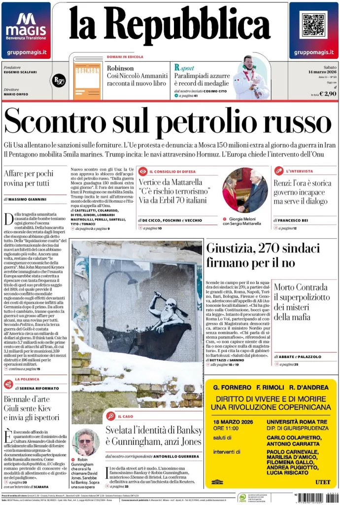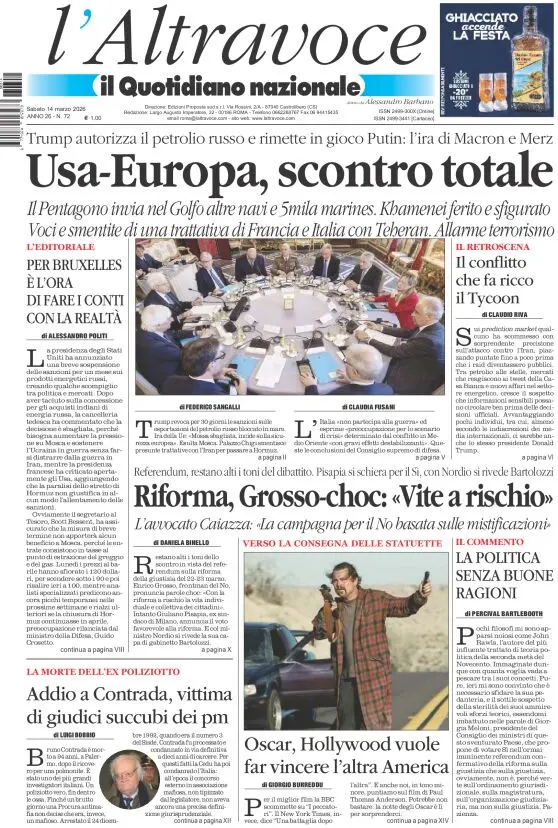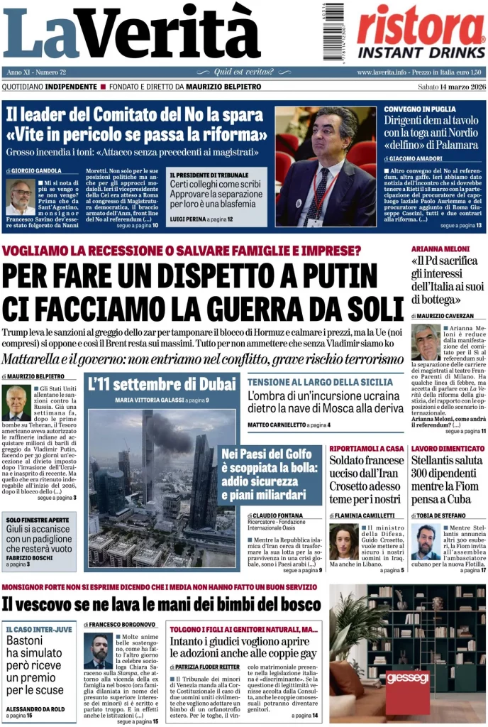 Le prime pagine delle maggiori testate giornalistiche siciliane, nazionali, economiche, sportive e straniere in Italia di Sabato 14 Marzo 2026