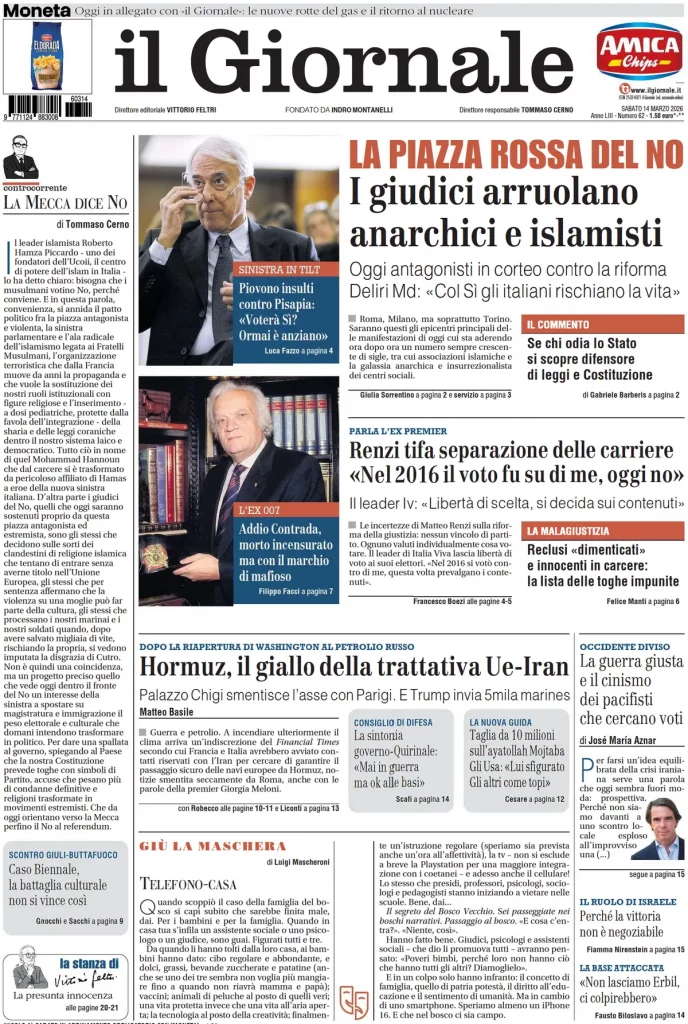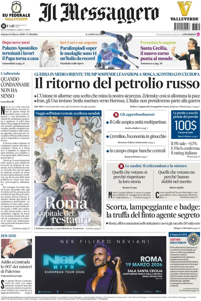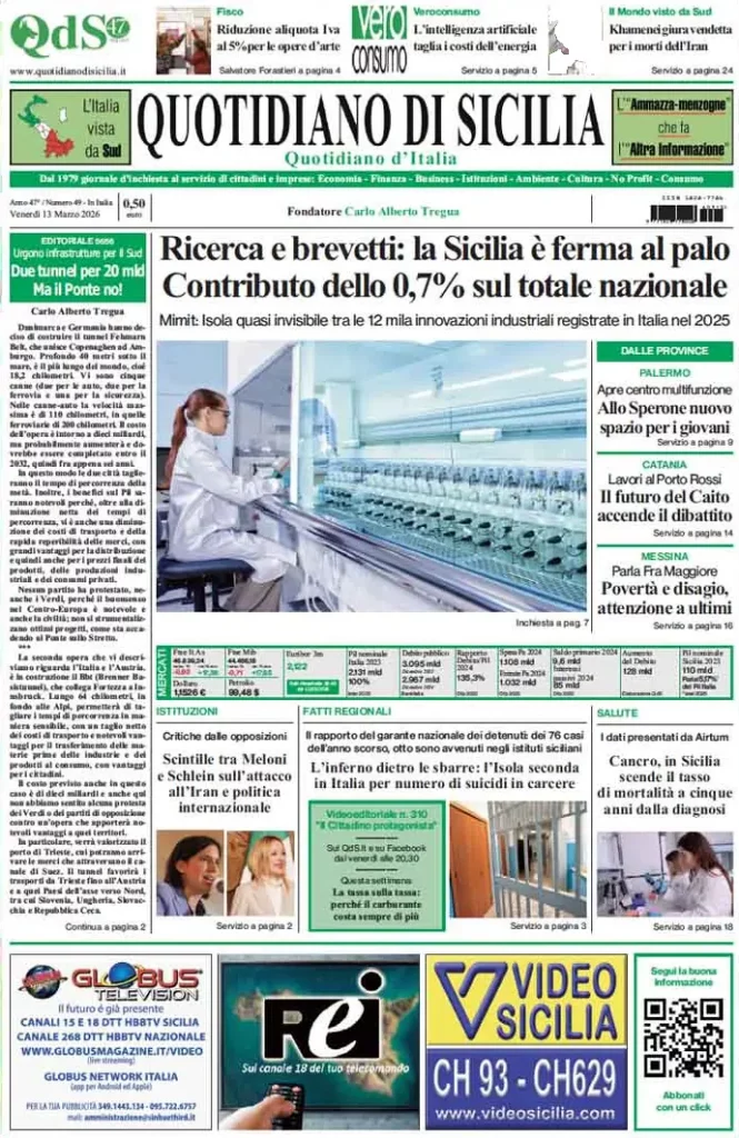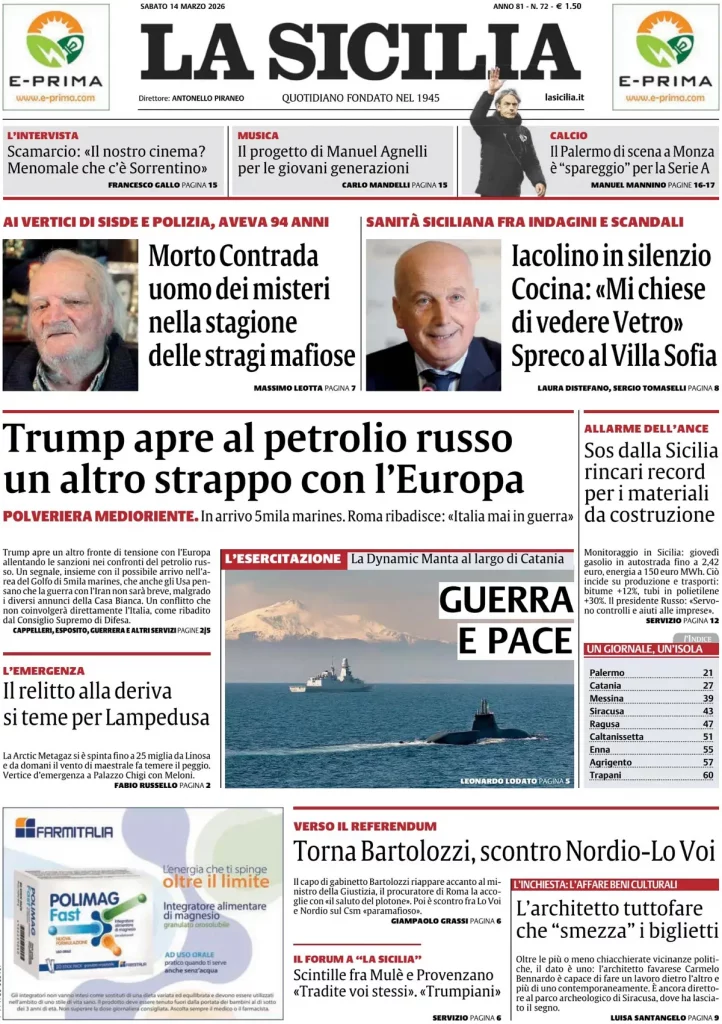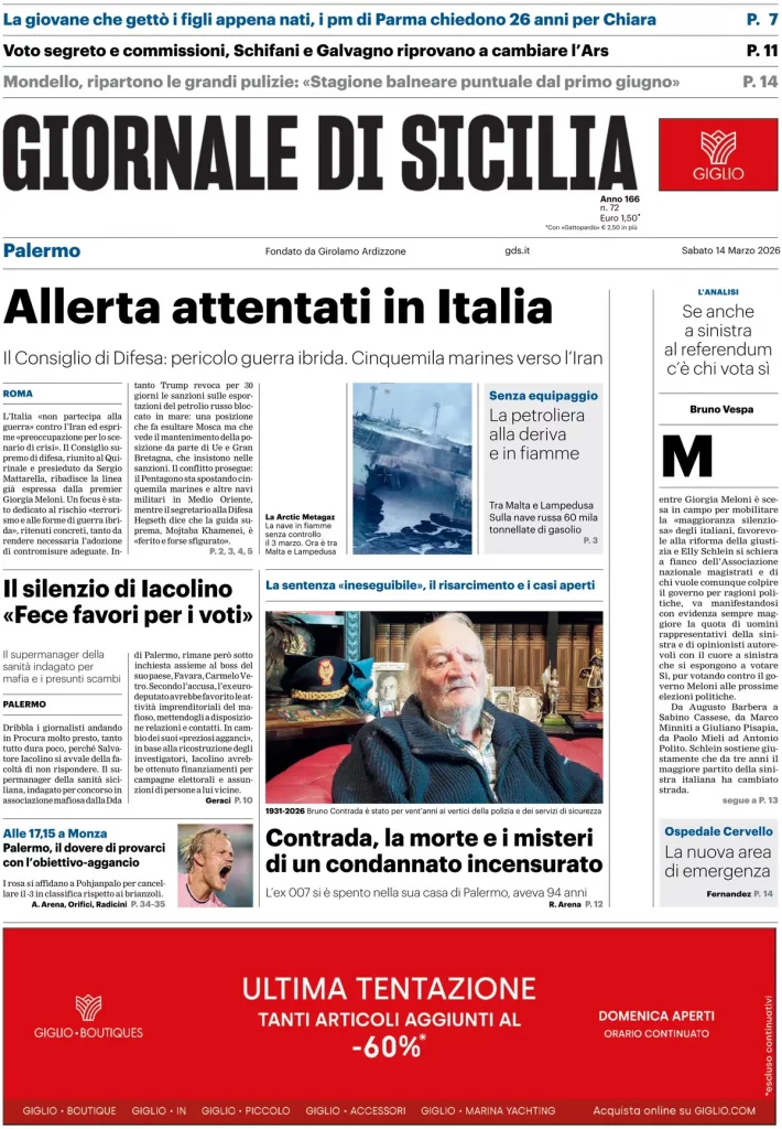 Caltanissetta 401 > News > Rassegna stampa > Le prime pagine delle maggiori testate giornalistiche siciliane, nazionali, economiche, sportive e straniere in Italia di Sabato 14 Marzo 2026