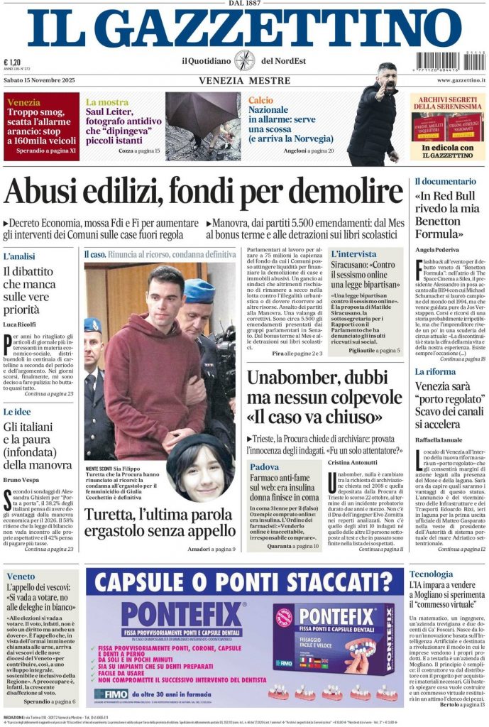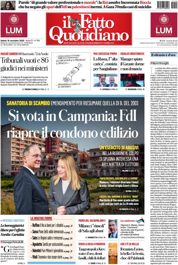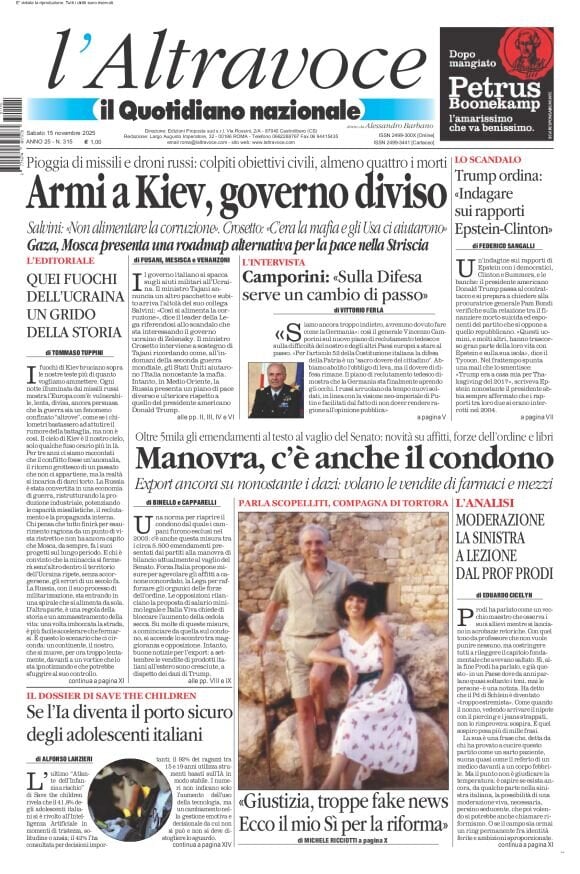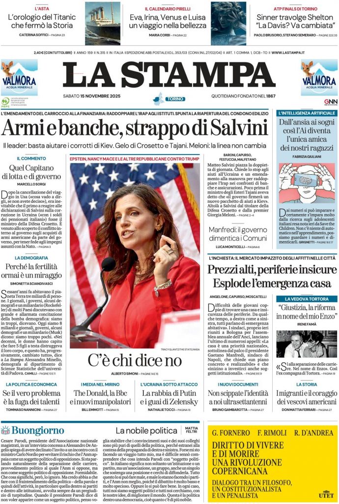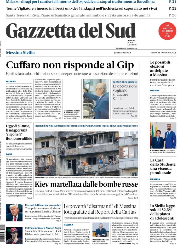 Le prime pagine delle maggiori testate giornalistiche siciliane, nazionali, economiche, sportive e straniere in Italia di Sabato 15 Novembre 2025