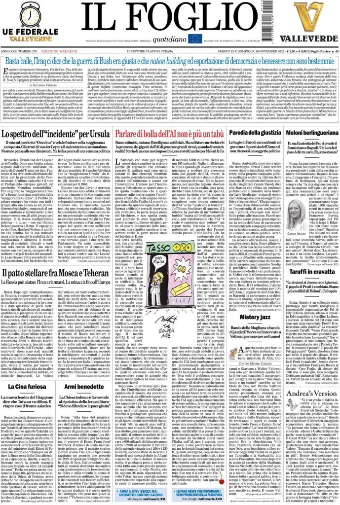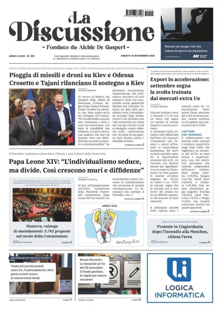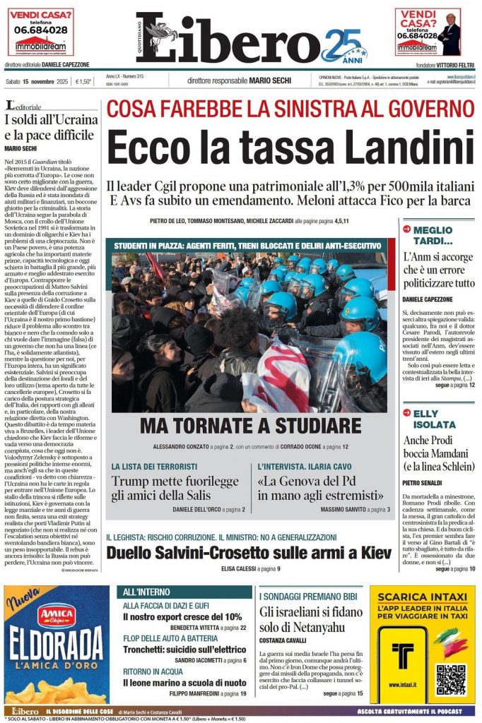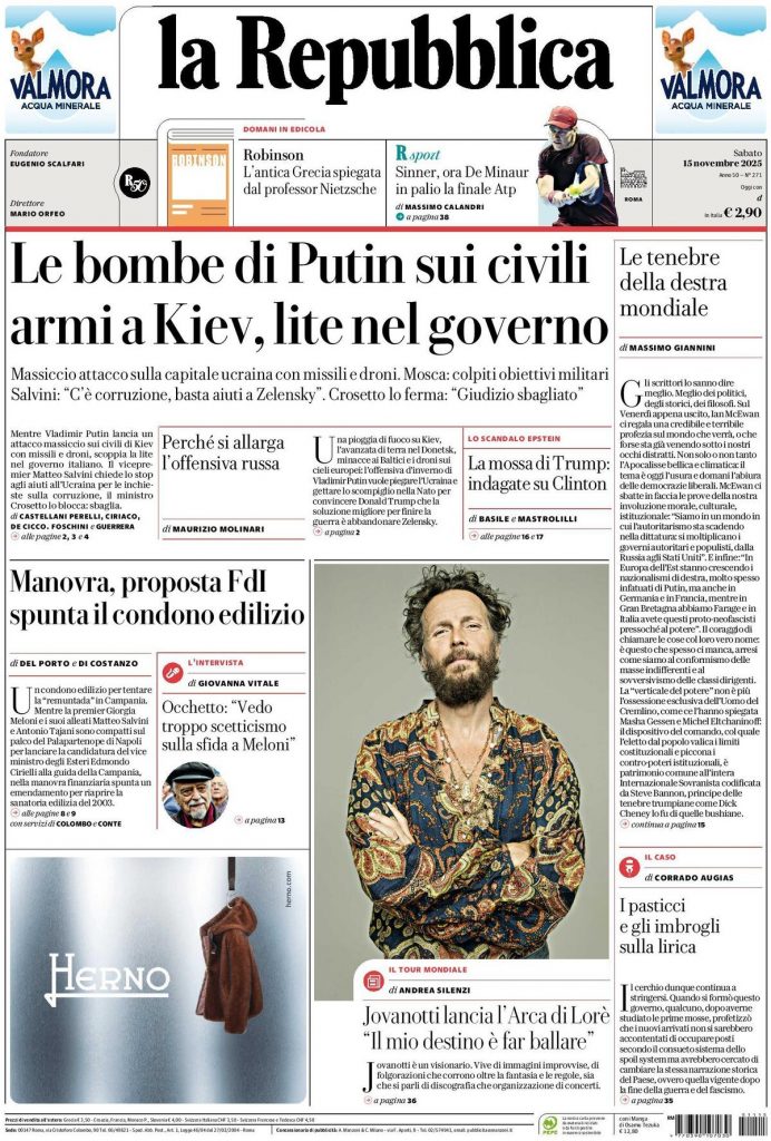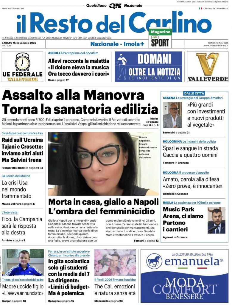 Le prime pagine delle maggiori testate giornalistiche siciliane, nazionali, economiche, sportive e straniere in Italia di Sabato 15 Novembre 2025