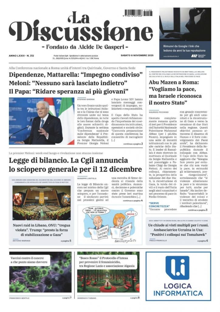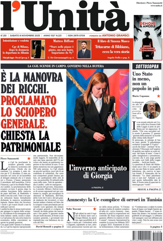 Le prime pagine delle maggiori testate giornalistiche siciliane, nazionali, economiche, sportive e straniere in Italia di Sabato 8 Novembre 2025