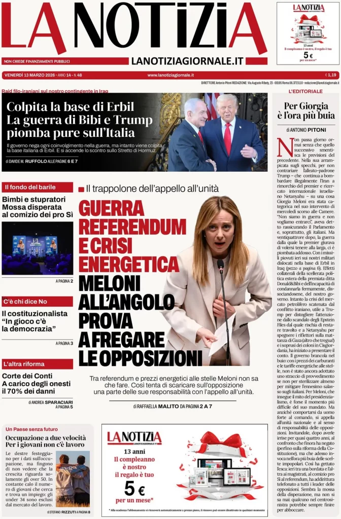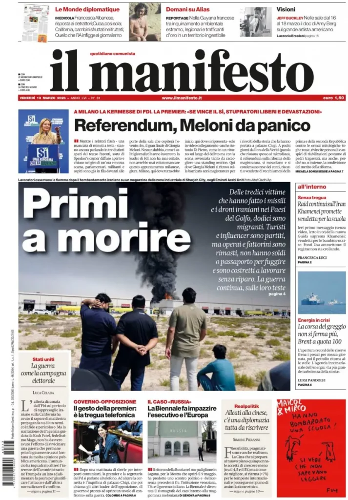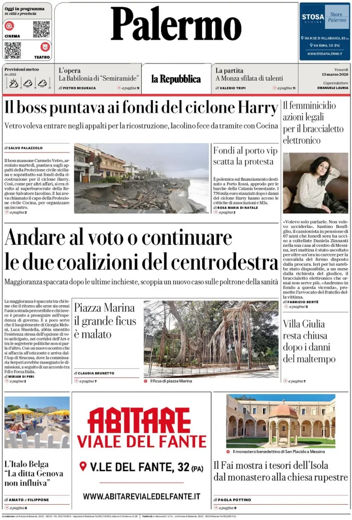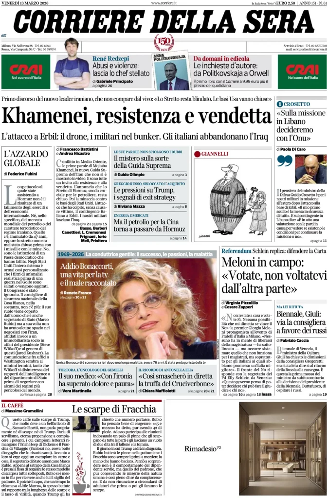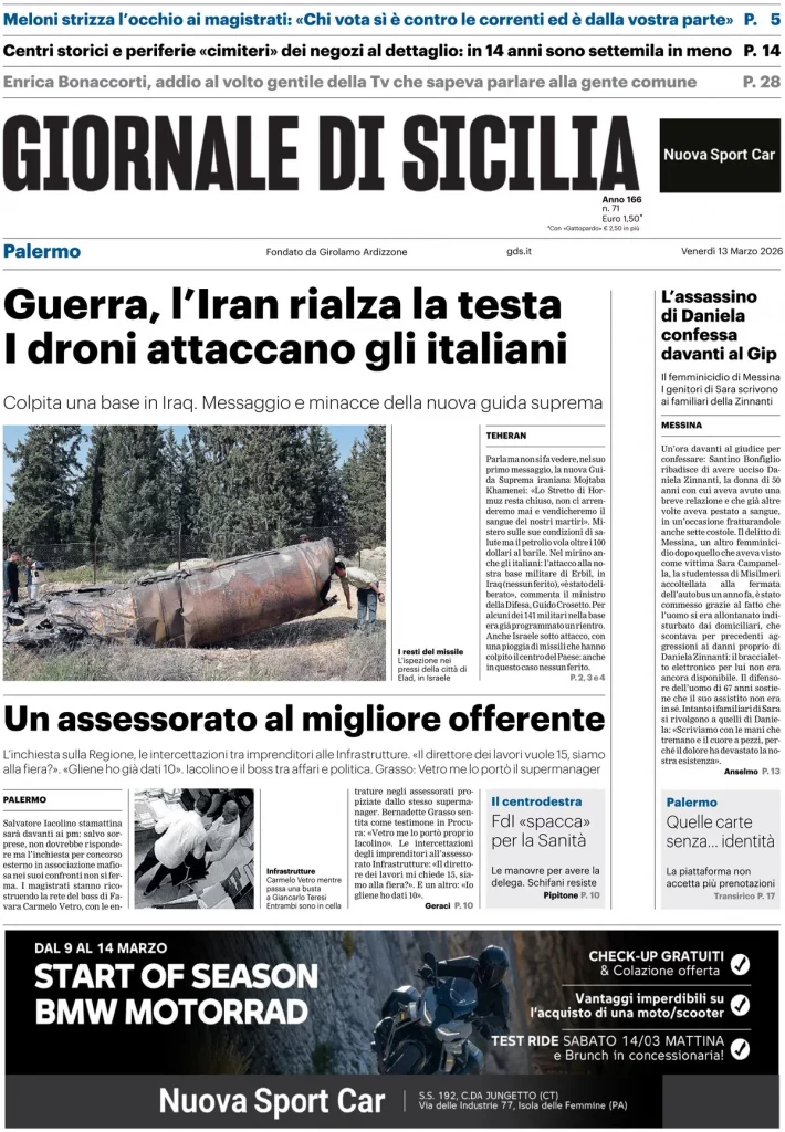 Reading: Le prime pagine delle maggiori testate giornalistiche siciliane, nazionali, economiche, sportive e straniere in Italia di Venerdì 13 Marzo 2026