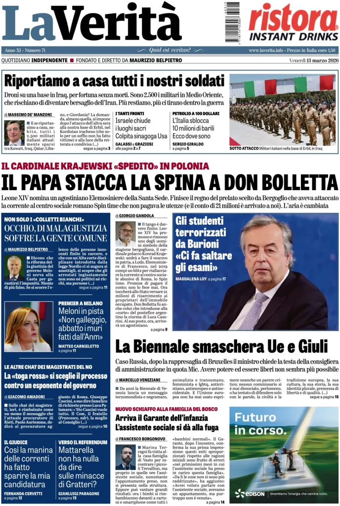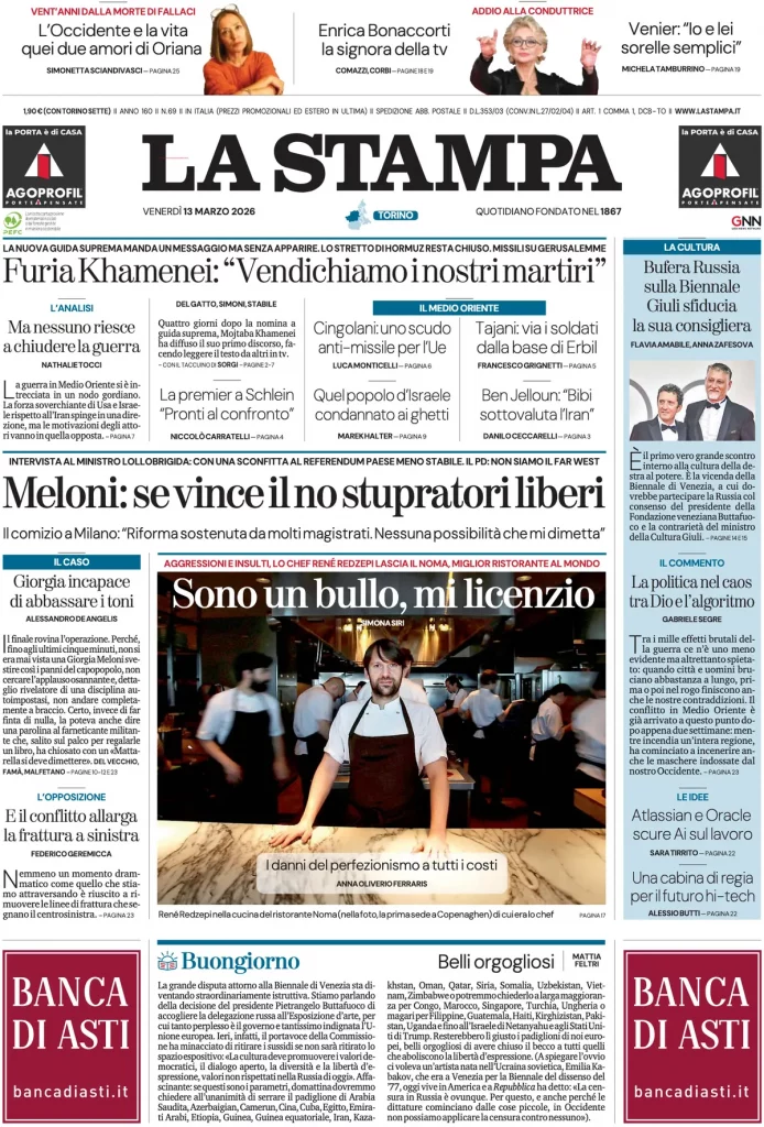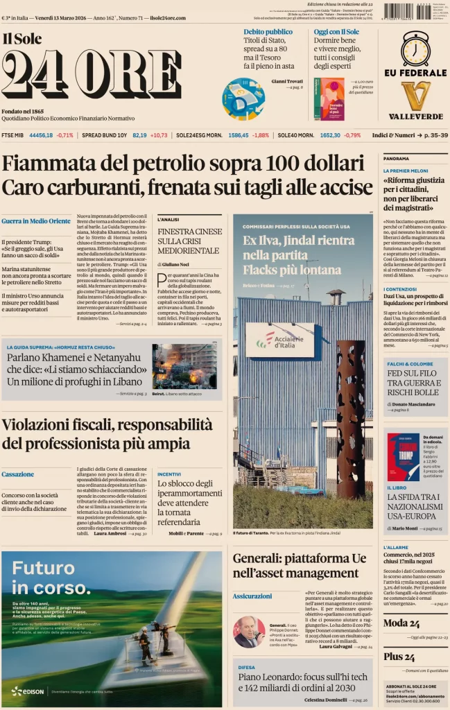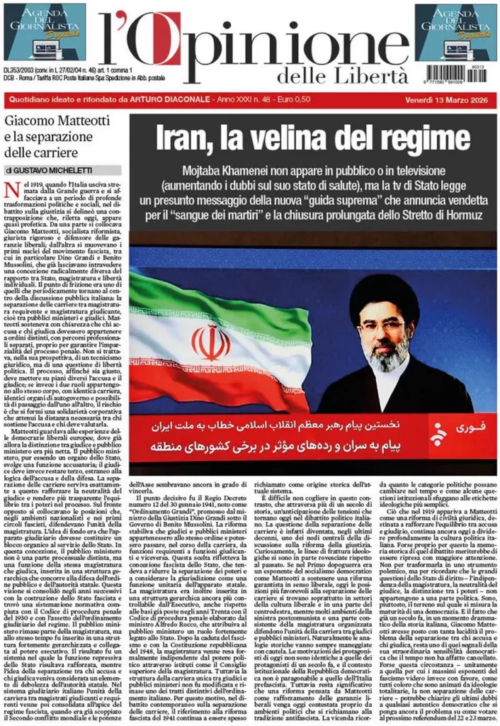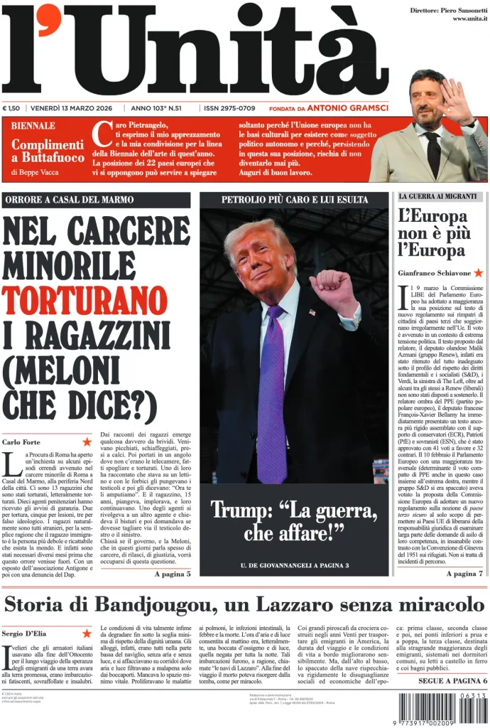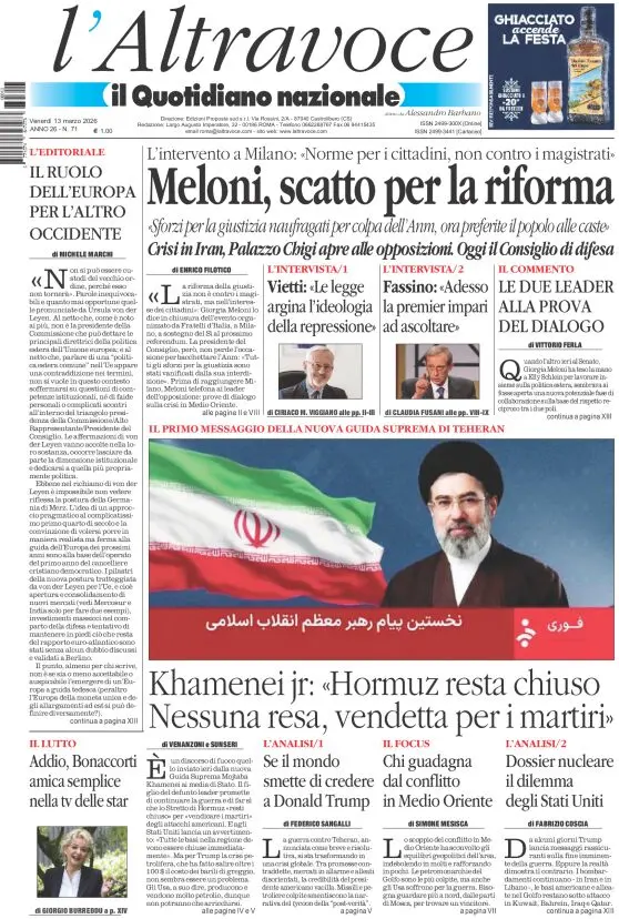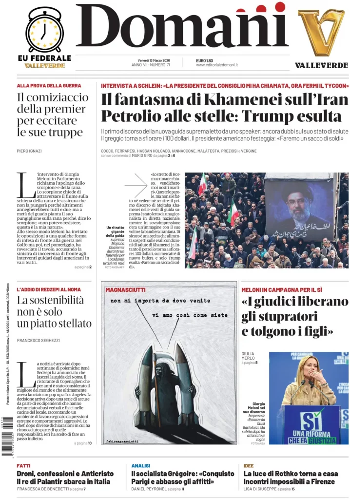 Le prime pagine delle maggiori testate giornalistiche siciliane, nazionali, economiche, sportive e straniere in Italia di Venerdì 13 Marzo 2026