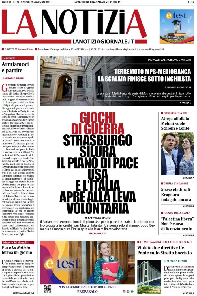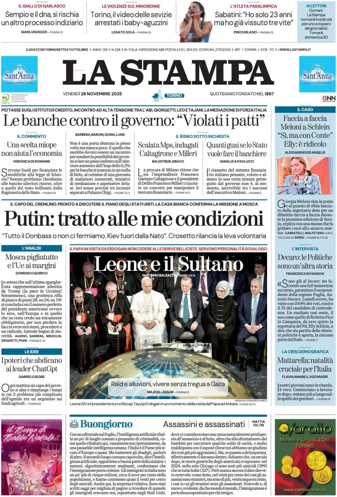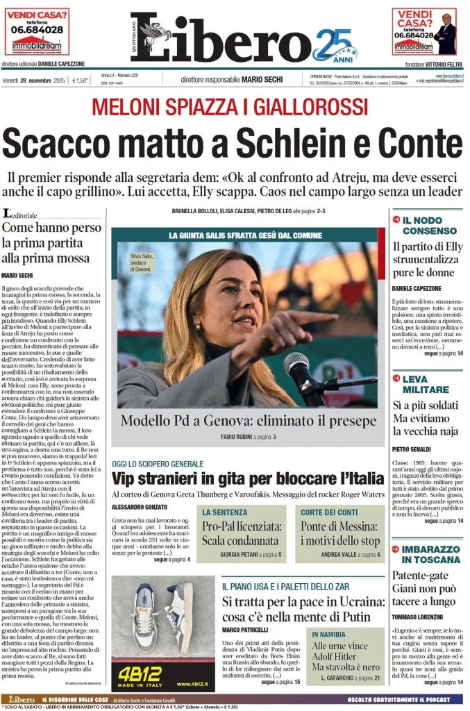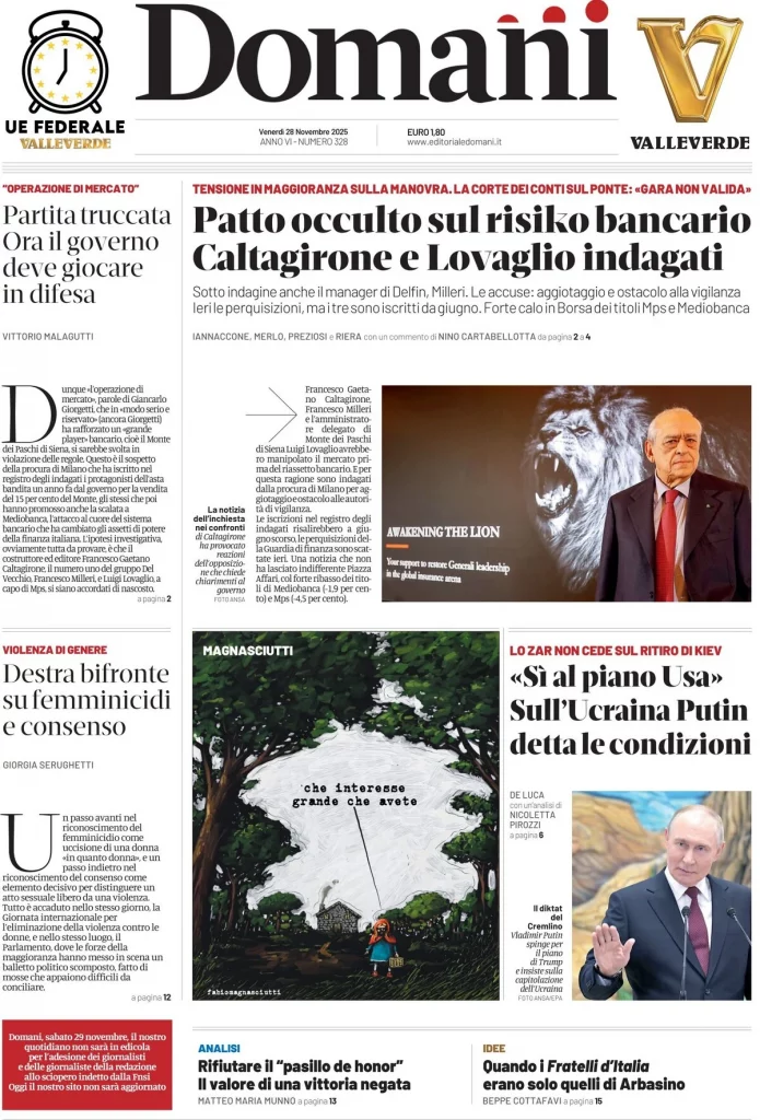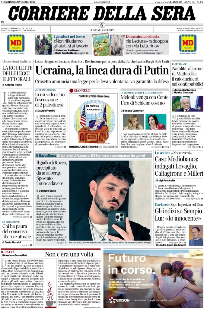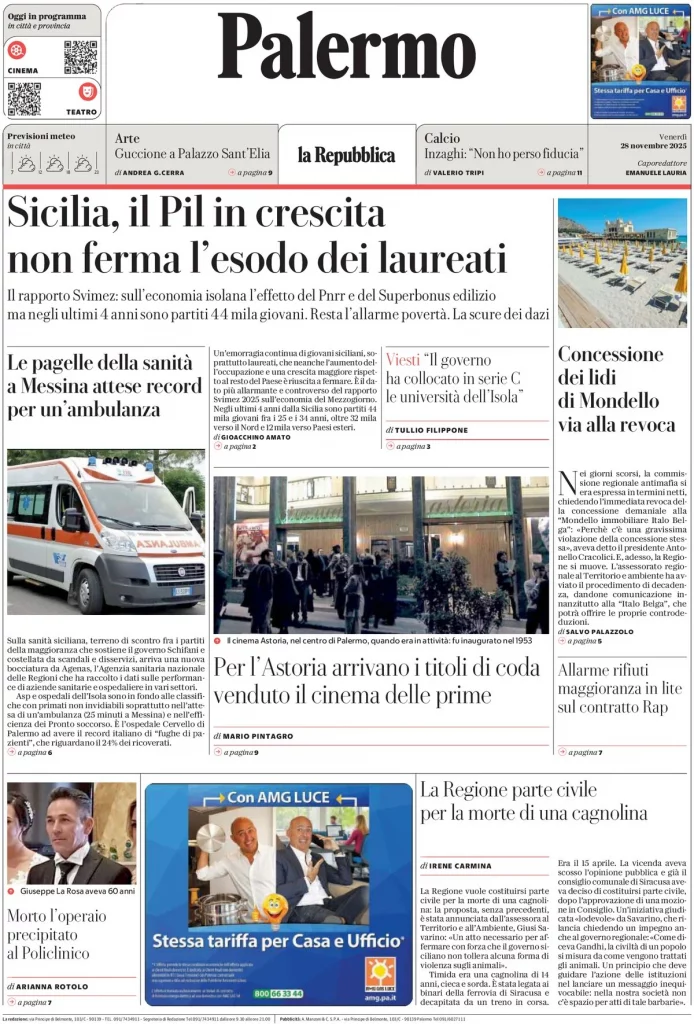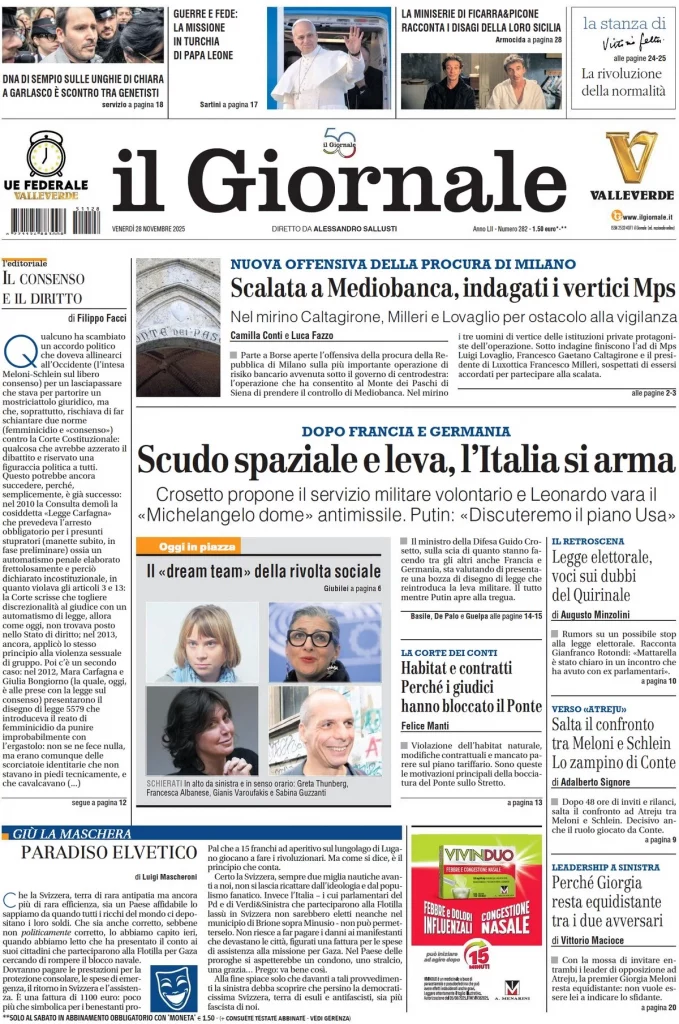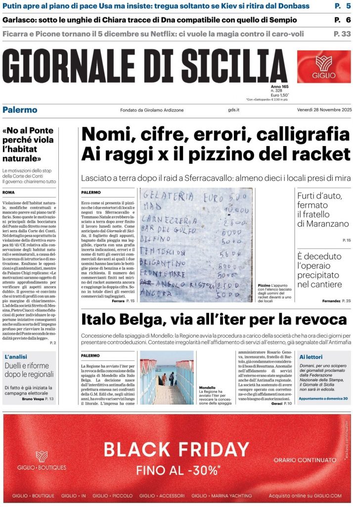 Reading: Le prime pagine delle maggiori testate giornalistiche siciliane, nazionali, economiche, sportive e straniere in Italia di Venerdì 28 Novembre 2025