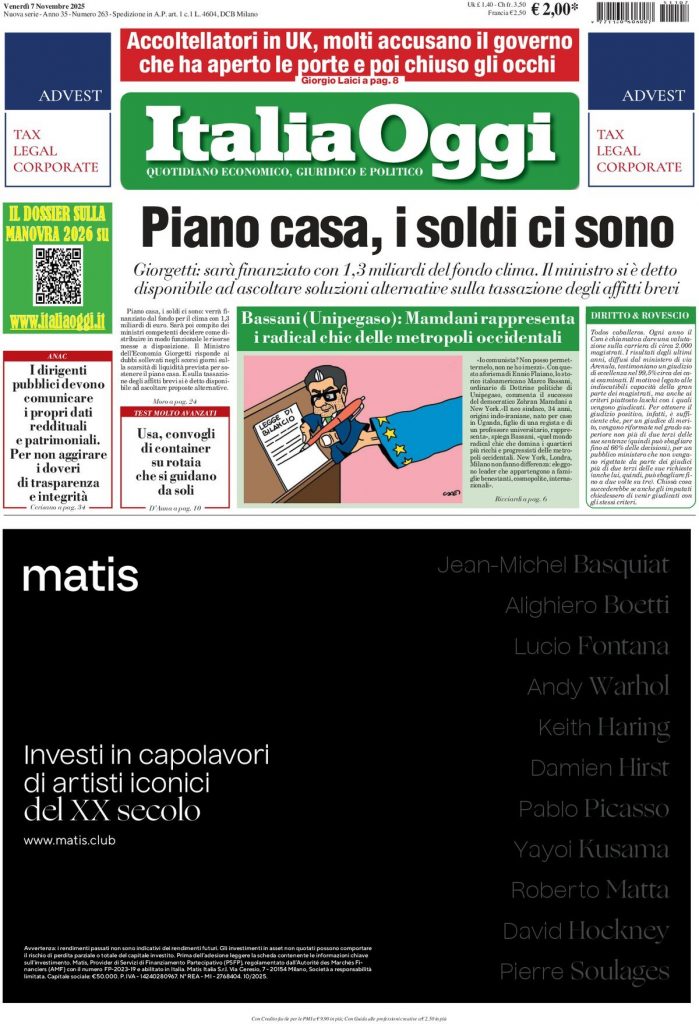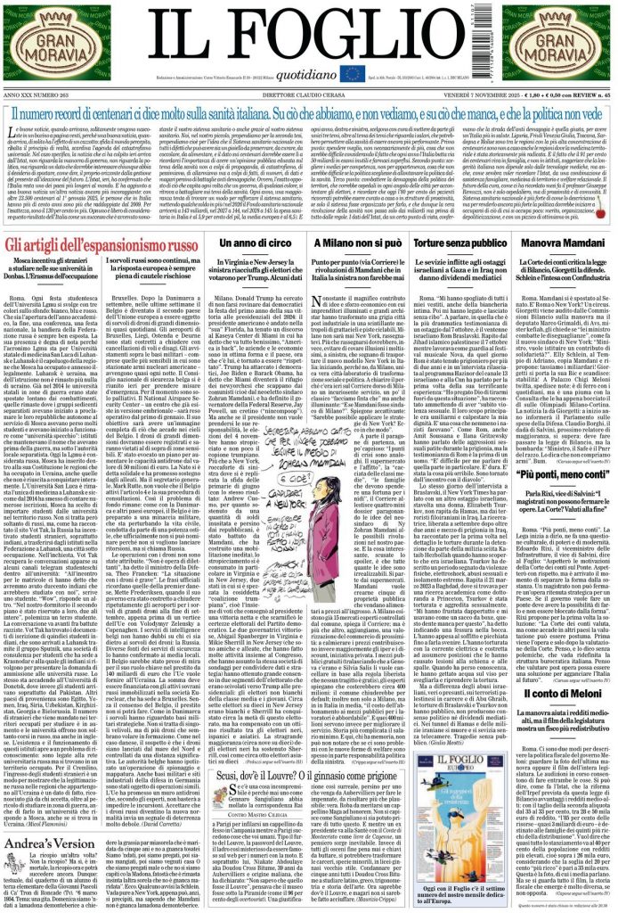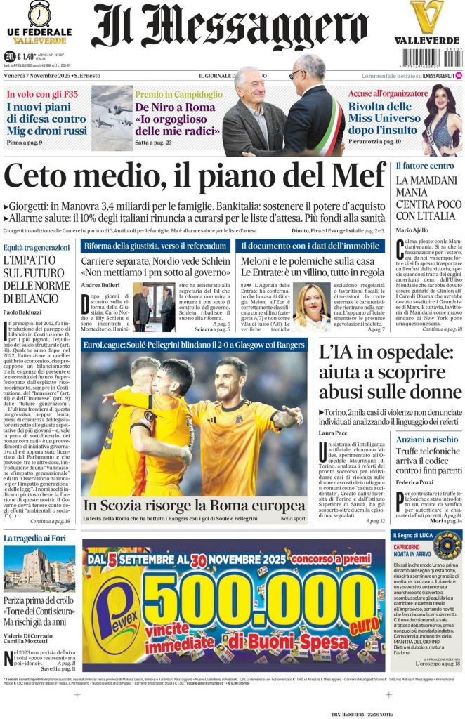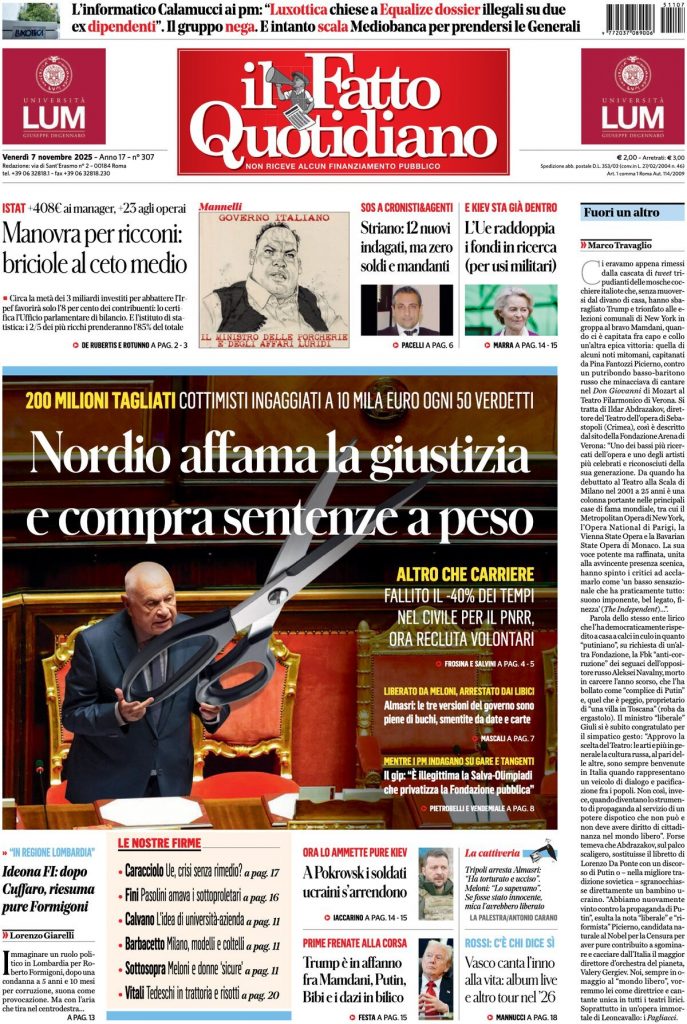 Le prime pagine delle maggiori testate giornalistiche siciliane, nazionali, economiche, sportive e straniere in Italia di Venerdì 7 Novembre 2025