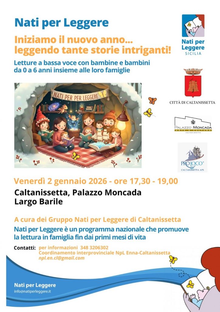 Le volontarie del gruppo locale di Caltanissetta del Programma Nazionale Nati per Leggere, hanno deciso di iniziare subito il nuovo anno invitando venerdì prossimo 2 Gennaio dalle ore 17,30 alle ore 19 nella Sala degli Oratori di Palazzo Moncada di Largo Barile a Caltanissetta, bambini e bambine di età da 0 a 6 anni con l’evento “Iniziamo il nuovo anno leggendo tante storie intriganti!”, invitando con loro genitori, nonni e nonne, zii e zie, per leggere a bassa ed alta voce libri creati appositamente per questa fascia di età.