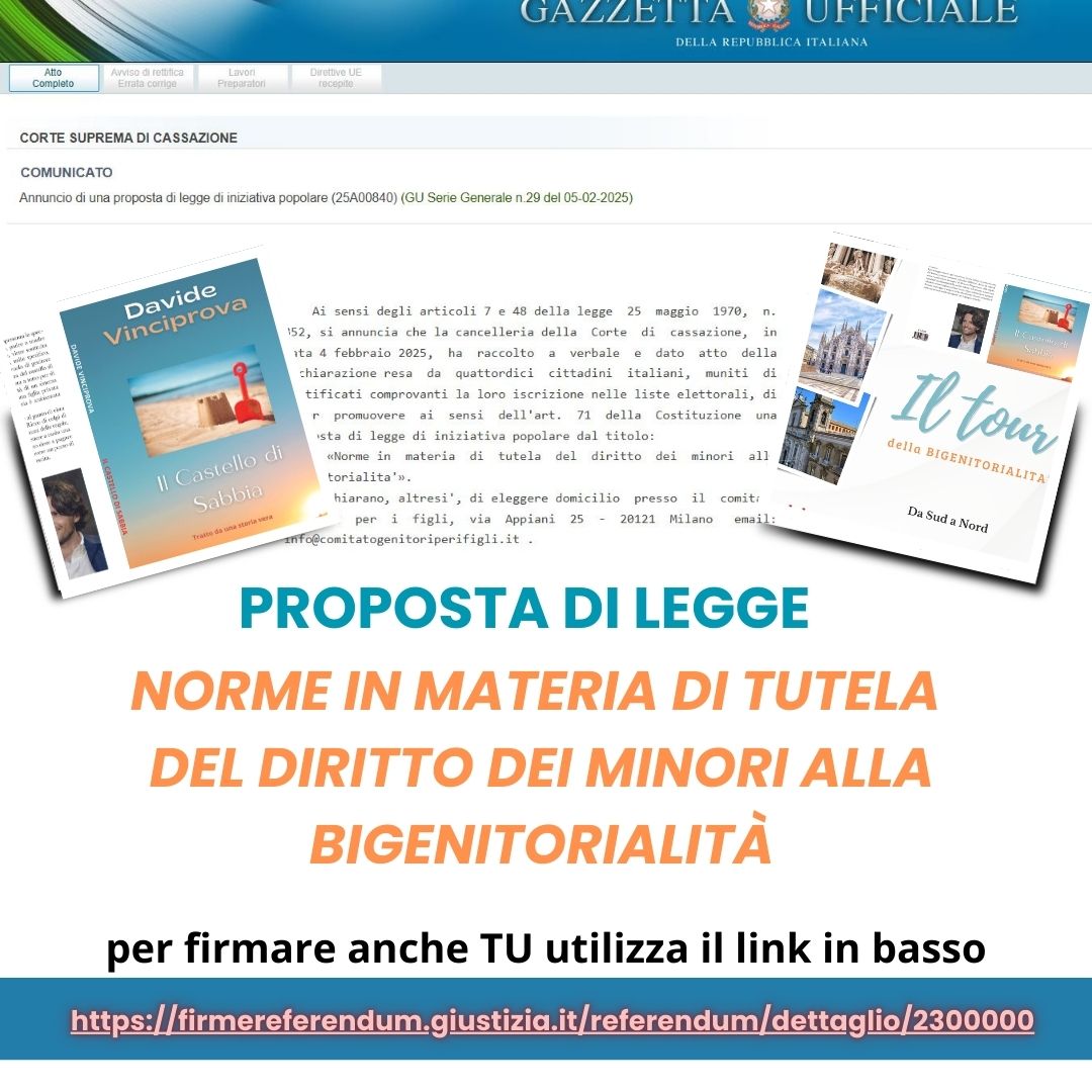 A causa dell’elevato numero di separazioni tra genitori, dove a pagare il prezzo più alto sono, purtroppo, sempre i figli, una delegazione nazionale composta da associazioni e professionisti del settore ha depositato presso la corte di cassazione una proposta di legge a tutela del diritto alla bigenitorialità, al fine di garantire la possibilità a tutti i minori di poter vivere il proprio percorso di crescita con entrambe le figure genitoriali.