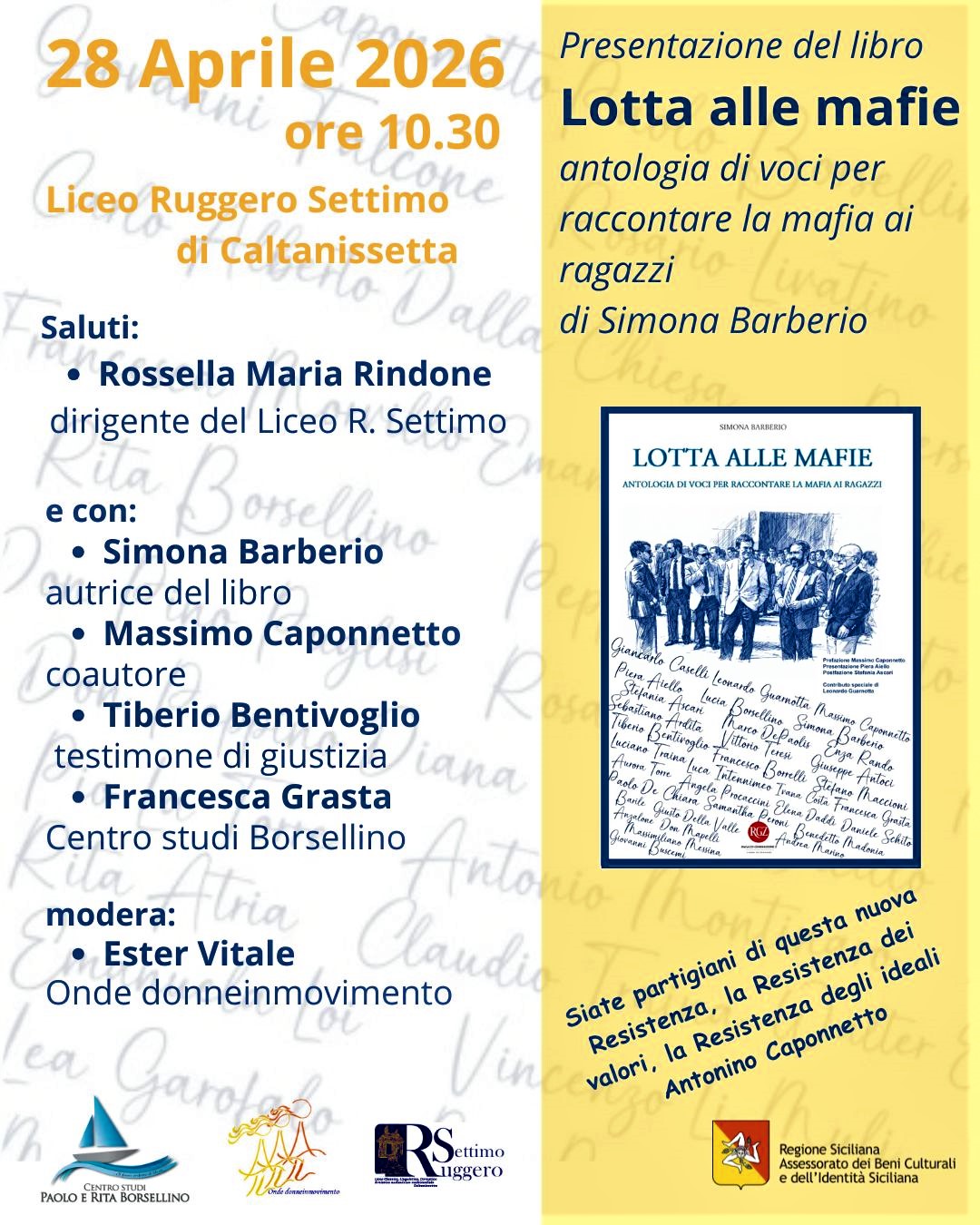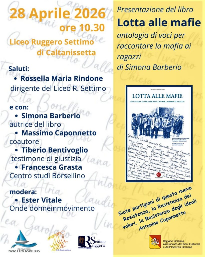 Martedì 28 aprile alle ore 10.30 presso il Liceo Classico Ruggero Settimo di Caltanissetta si terrà la presentazione del libro “Lotta alle mafie. Antologia di voci per raccontare la mafia ai ragazzi” di Simona Barberio.