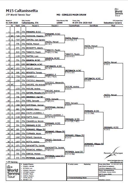 Manuel Mazza ha vinto l’ITF da 15.000 dollari Torneo Internazionale Città di Caltanissetta Trofeo BCC G. Toniolo e San Michele di San Cataldo. Il riminese, 26 anni, ha superato Gianmarco Ferrari per 62 64; per il toscano un doloroso déjà vu, anche lo scorso anno era stato sconfitto in finale.