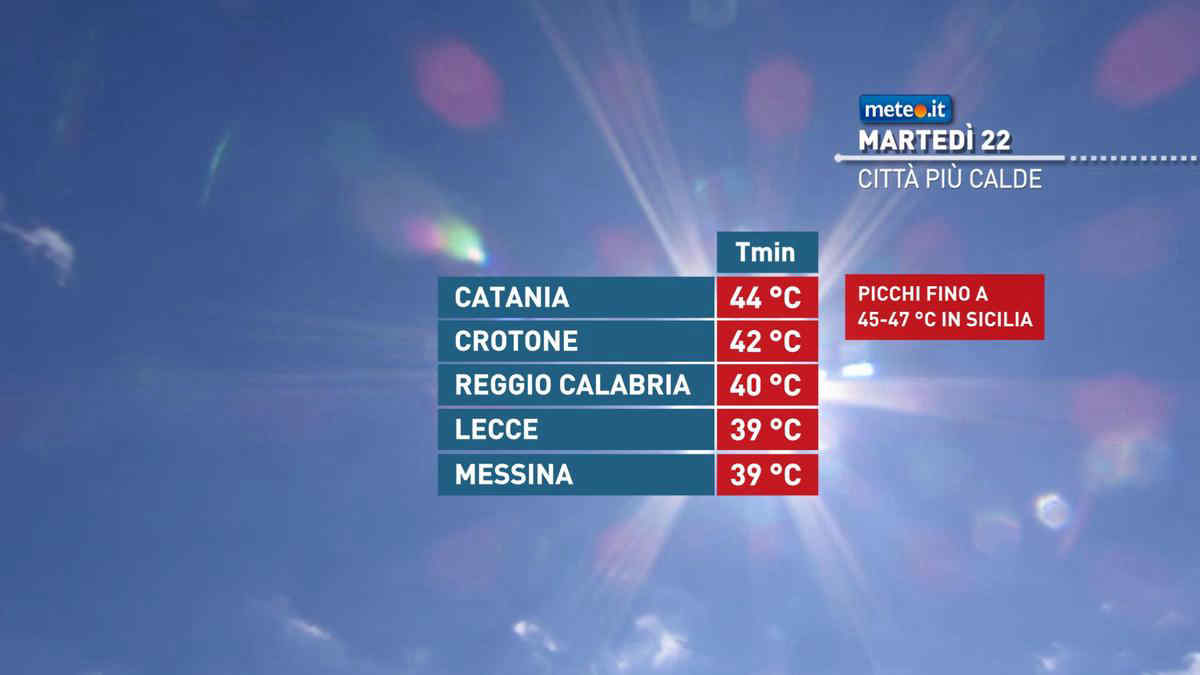 Addirittura nella giornata di oggi (martedì 22) per un effetto Foehn, associato ad un temporaneo rinforzo dei venti di Maestrale, sulla Sicilia orientale e sulla Calabria ionica si potrebbero toccare picchi vicini ai 45 °C; nell’isola non esclusi picchi di 46-47°C nel Catanese e Siracusano.