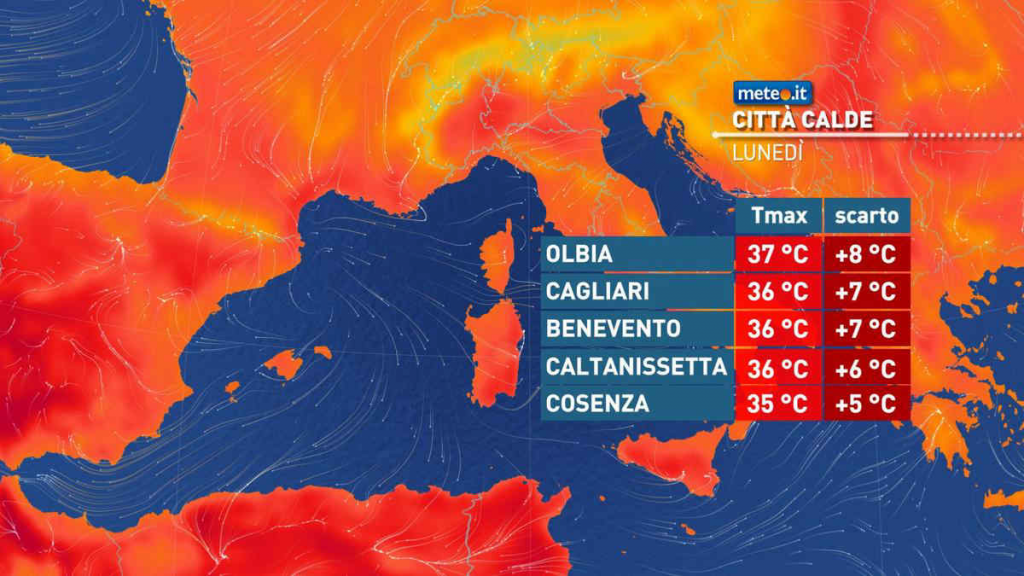 Temperature massime in calo al Nord e Sardegna occidentale; in leggera flessione anche nelle regioni tirreniche, senza grandi variazioni altrove. Valori fino a 37-38 gradi sulla Sardegna tirrenica e 35-36 al Sud, Sicilia e Lazio. Venti di Maestrale in moderato rinforzo sul mare di Sardegna e di Corsica; si attenua il Libeccio nel mar Ligure; venti deboli altrove salvo rinforzi di brezza lungo le coste. Mari: mossi il Mar Ligure, il mare di Corsica e di Sardegna, l’alto Tirreno e l’alto Adriatico.