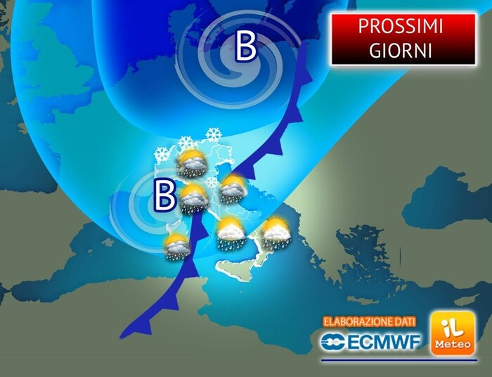 Le massime scenderanno ben al di sotto della media stagionale e anche le minime potrebbero toccare valori vicini allo zero in molte località del Centro-Nord in particolare nelle zone raggiunte da eventuali e temporanee schiarite.