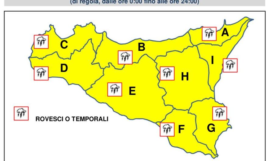 È stata diramata un’allerta gialla in nove regioni, tra cui l’intera Sicilia, dove il rischio temporali interesserà tutte le province.