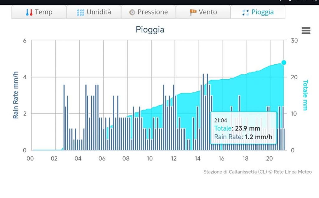 Rara giornata di pioggia continua su Caltanissetta e nel centro Sicilia.Infatti le piogge nelle nostre aree sono spesso distribuite sulla base di fenomeni intensi di durata breve.Ancora di più negli ultimi anni, che hanno visto accentuarsi questa ripartizione in favore di episodi violenti e saltuari.Invece oggi, come da grafico allegato della stazione meteo di Caltanissetta via Piave, la pioggia è stata debole, fine, continua.Di fatto non ha mai smesso dalle ore 2.00 am, portando il parziale giornaliero alle ore 21.30 a oltre 24mm.Anche per questo motivo l’escursione termica è stata minima, solo 2 gradi tra minima e massima.Ovviamente l’umidità media si è mantenuta sempre prossima alla saturazione.Piogge del genere sono le migliori: non va sprecata neanche una goccia e vanno a permeare profondamente i terreni (già molto umidi per via dell’ottimo periodo piovoso instauratosi già da dicembre).E ora? Lento miglioramento, domani molte nubi ma piogge relegate all’estremo settore orientale, sebbene nel pomeriggio qualche fenomeno residuo potrebbe interessare il centro della regione. Da domenica miglioramento definitivo e temperatura in deciso aumento.