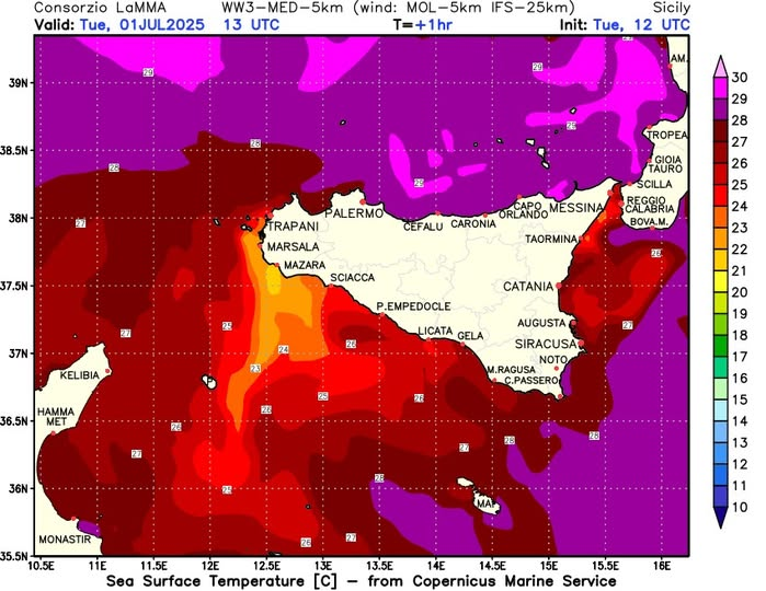 Breve accenno anche alle temperature dei nostri mari, che anche oggi si prevedono piuttosto alte in particolar modo nelle isole Eolie: ad Alicudi si raggiungeranno i +28,6°C. Invece, la temperatura dell’acqua più bassa la troveremo in quel di Mazara del Vallo (TP) con +21,6°C. Valori notevoli anche lungo il tratto di mare Palermo-Messina (costa Tirrenica) laddove la temperatura del mare in superficie raggiungerà i 27°C.
