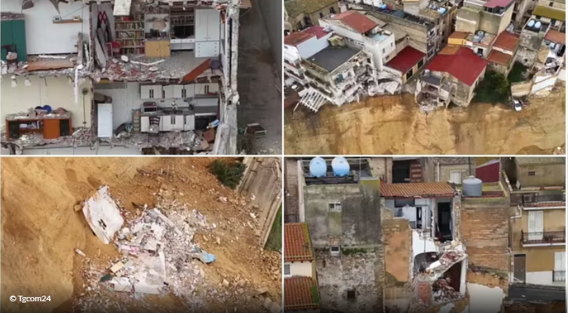 A Niscemi, dove piove da 48 ore consecutive, la situazione peggiora di ora in ora. È infatti crollata una palazzina di tre piani nel quartiere Sante Croci, una di quelle in bilico sul costone. L’edificio crollato era a pochi metri dall’immagine simbolo dell’auto sul precipizio. Non solo, a causa delle continue precipitazioni e movimenti franosi, altri edifici vicini a quello crollato e in bilico sul costone, sono squarciati. Dall’alto sono visibili negli immobili pezzi di stanze, mobili, elettrodomestici, in alcuni casi si notano foto appese sui muri di famiglie con bambini. Le abitazioni si sbriciolano lentamente, fino al cedimento definitivo come nel caso della palazzina di tre piani.