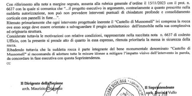 In sostanza, a partire dalle motivazioni di carattere strutturale fornite dai progettisti, tutti ingegneri, la Soprintendenza ribalta la prescrizione contenuta nel precedente parere, reso in Conferenza dei Servizi del 10/03/2023, scrivendo che “… il progetto esecutivo non può non prevedereinterventi puntuali di chiodature profonde e consolidamento corticale con pannelli in fune…”. E ancora: “Ritenuto prioritariamente che ogni intervento inerente il ‘Castello di Mussomeli, ivi compresa la rocca ove esso sorge deve essere orientato a salvaguardare il pregio architettonico dell’immobile nella sua complessiva e originaria struttura. Considerate tuttavia le motivazioni con relative condizioni, rappresentate nella succitata nota n. 6637 del 15/11/2023 di codesto Ufficio, con la presente si prende atto di quanto in essa espresso, ritenuta prioritaria la messa in sicurezza della rocca. Ribadendo tuttavia che la suddetta rocca è parte integrante del bene monumentale denominato ‘Castello di Mussomeli’ si raccomanda di adottare tutte le misure idonee a mitigare l’impatto visivo dell’intervento in parola, da concordare in fase esecutiva con questa Soprintendenza”.