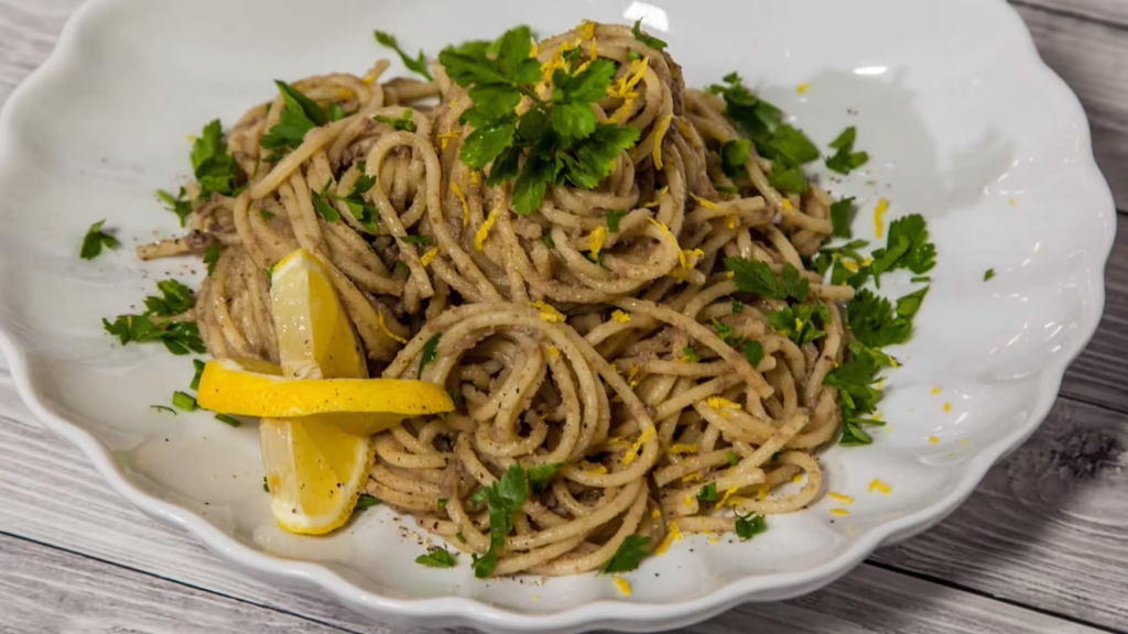 - Servire gli spaghetti fumanti, con una grattugiata di scorza di limone.
