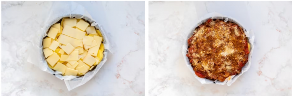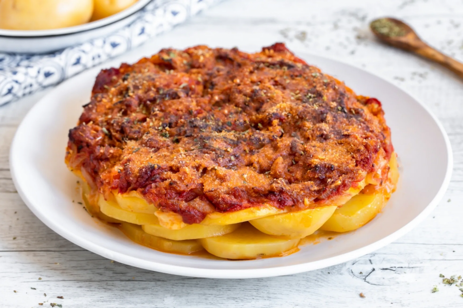 3-Foderate con carta forno una teglia da circa 24 cm di diametro e ungetene la base con olio. Adagiatevi all’interno le patate, salatele appena e corspargetele con origano secco a piacere e fettine di caciocavallo. Coprite con il sugo preparato, cospargete con caciocavallo grattugiato, pangrattato e origano e cuocete nel forno già caldo a 200° per 45 minuti circa, quando sulla superficie si sarà formata una crosticina. Verificate la cottura con i rebbi di una forchetta che dovranno entrare nelle patate agevolmente.