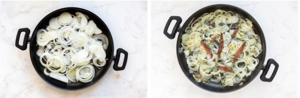 1-Per preparare le patate a sfincione iniziate a tagliare le cipolle a rondelle sottili. Fatele appassire in una casseruola antiaderente con abbondante olio. Quando saranno diventate morbide unite i filetti di acciuga, scolati dal loro olio, e lasciateli sciogliere aiutandovi con un cucchiaio di legno.