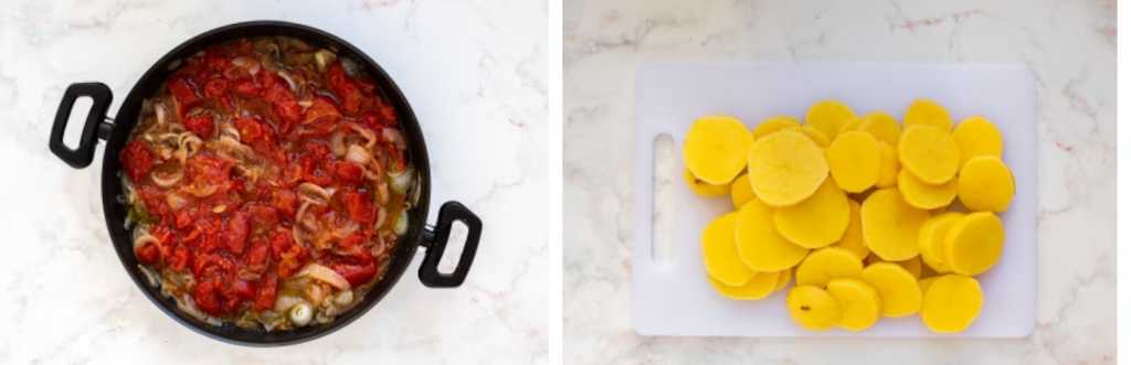 2-Unite i pelati tagliati a dadini, aggiustate di sale e pepe e cuocete per circa 10-15 minuti, fino a quando il fondo di cottura si sarà ristretto. Sbucciate le patate, lavatele, tamponatele con carta da cucina e tagliatele a fettine spesse poco più di mezzo centimetro.