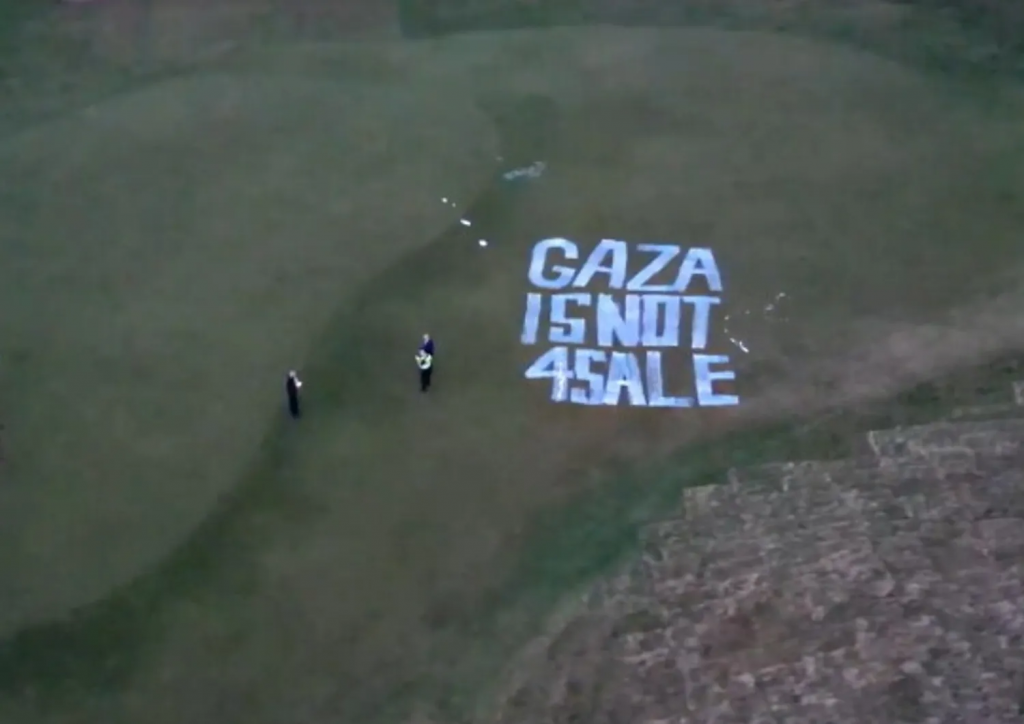 Questa mattina presto, il campo da golf è stato preso di mira da attivisti che hanno scritto un messaggio a caratteri cubitali, danneggiando la buca più prestigiosa del percorso.