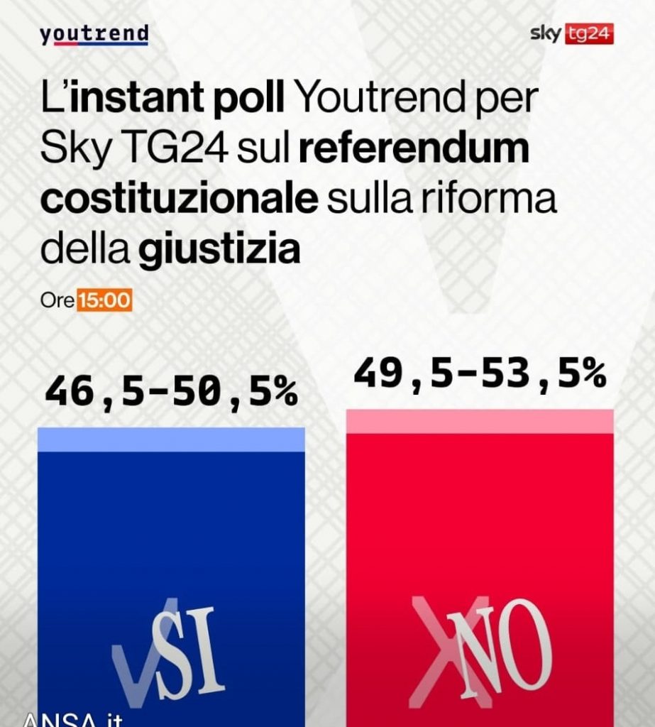 REFERENDUM: L’instant poll di YouTrend per Sky TG24 indica la prevalenza del No al referendum sulla riforma della Giustizia, con una forchetta compresa tra il 49,5% e il 53,5%
